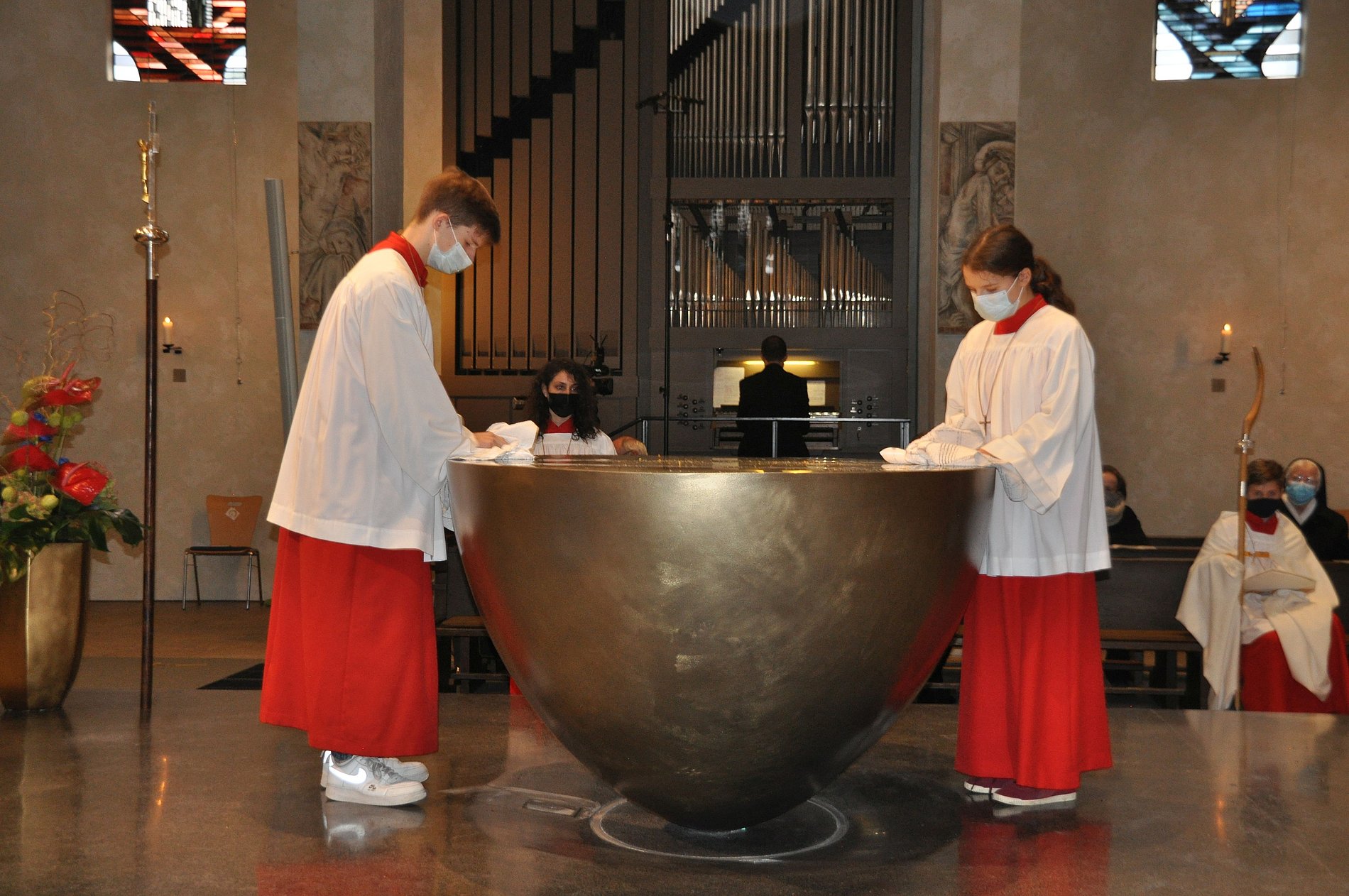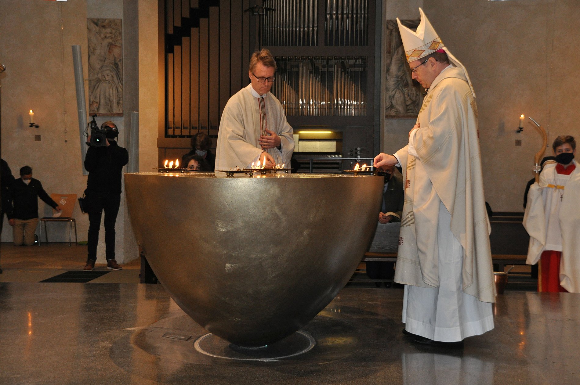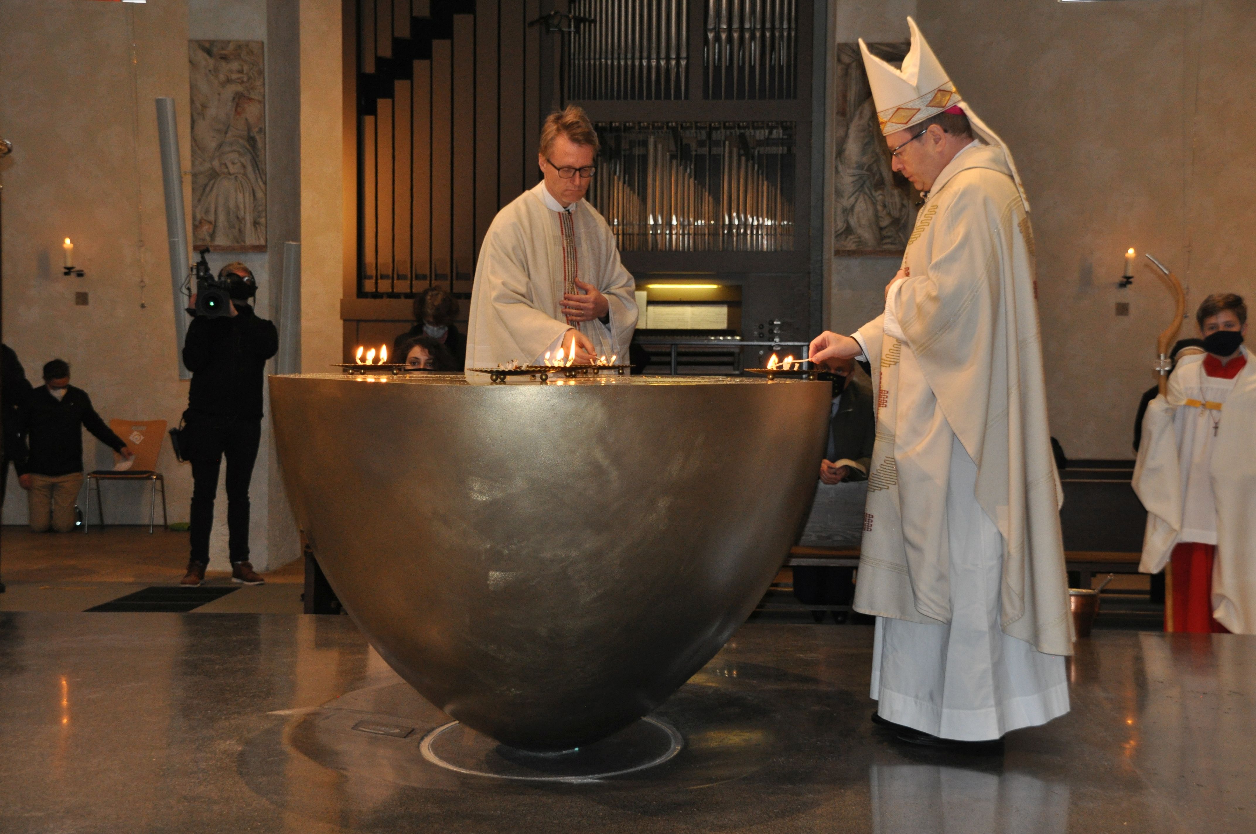Mit einem entschlossenen Schritt und ernster Miene stieg Pfarrer Joachim Braun auf das Podest. Vorsichtig entzündete er einen Docht am Feuer der Osterkerze, dann trug er das Licht zum bereits mit Chrisam gesalbtem Altar. Gemeinsam mit Bischof Georg Bätzing entfachte der Pfarrer von Sankt Marien das Feuer in den fünf bereitstehenden Schalen und bedeckte sie anschließend mit Weihrauch, der sofort seinen würzigen Duft verbreitete. Ein feierlicher Moment in absoluter Stille, die schließlich vom Chorgesang der Schola Sankt Antonius Rödelheim unter Leitung von Annemarie Jacob abgelöst wurde. „Das berührt mich gerade sehr“, flüsterte eine Besucherin ihrem Mann zu. So wie ihr ging es an diesem Sonntagmorgen in Bockenheim und daheim vor den Bildschirmen sicher auch vielen anderen Menschen.