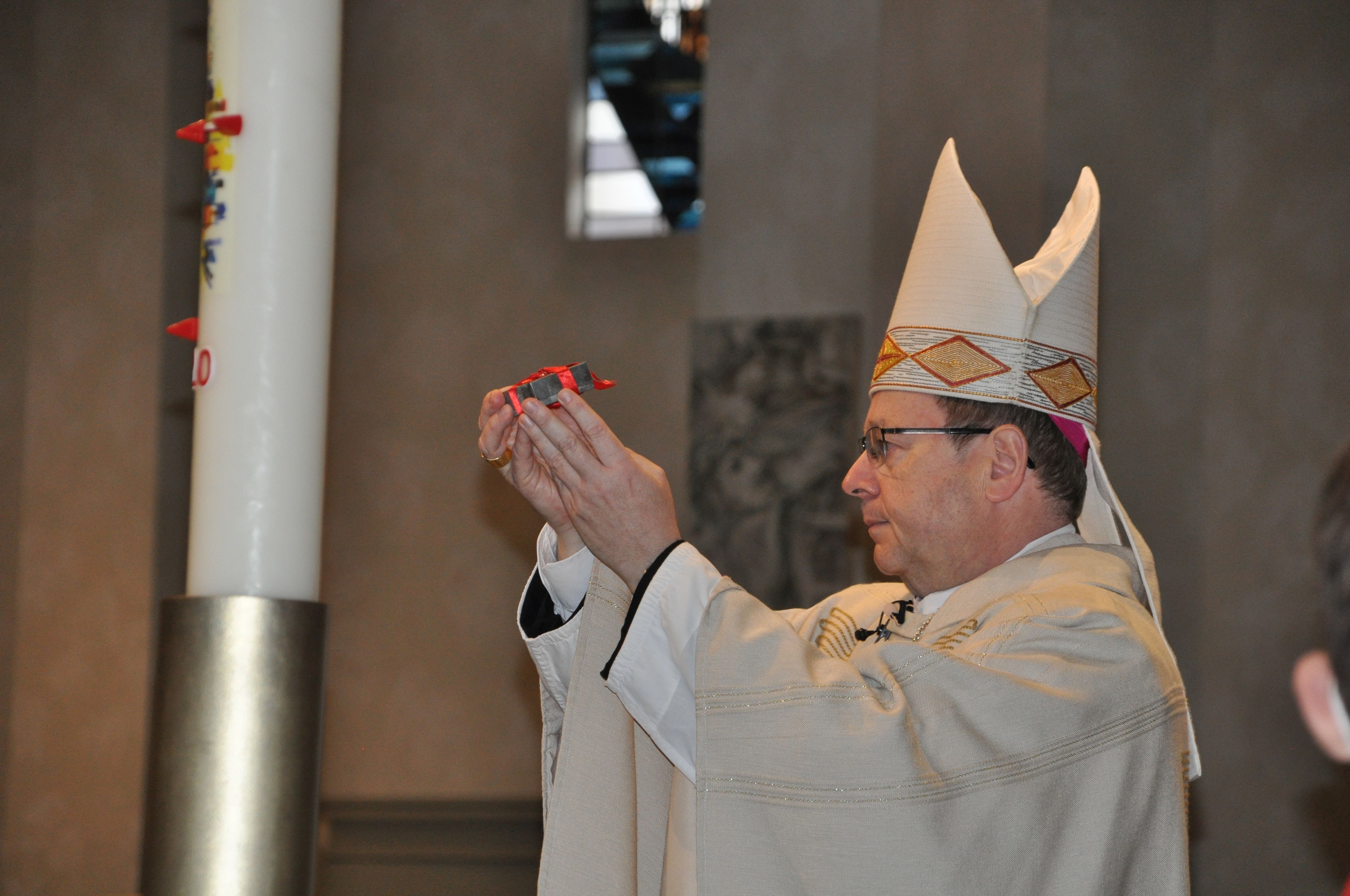 Zwei Jahre war geplant, drei gebaut worden. Heute nun wurde die Frauenfriedenskirche mit einem bewegenden Gottesdienst wiedereröffnet. Zentraler Punkt des Gottesdienstes war die Altarweihe durch Bischof Bätzing. Der neue Mittelpunkt des Gotteshauses ist etwas ganz Besonderes: Geschaffen von Tobias Kammerer erinnert der Altar an ein halbes goldenes Ei – „das Symbol des Lebens und der Auferstehung“, wie es im Programmheft heißt.