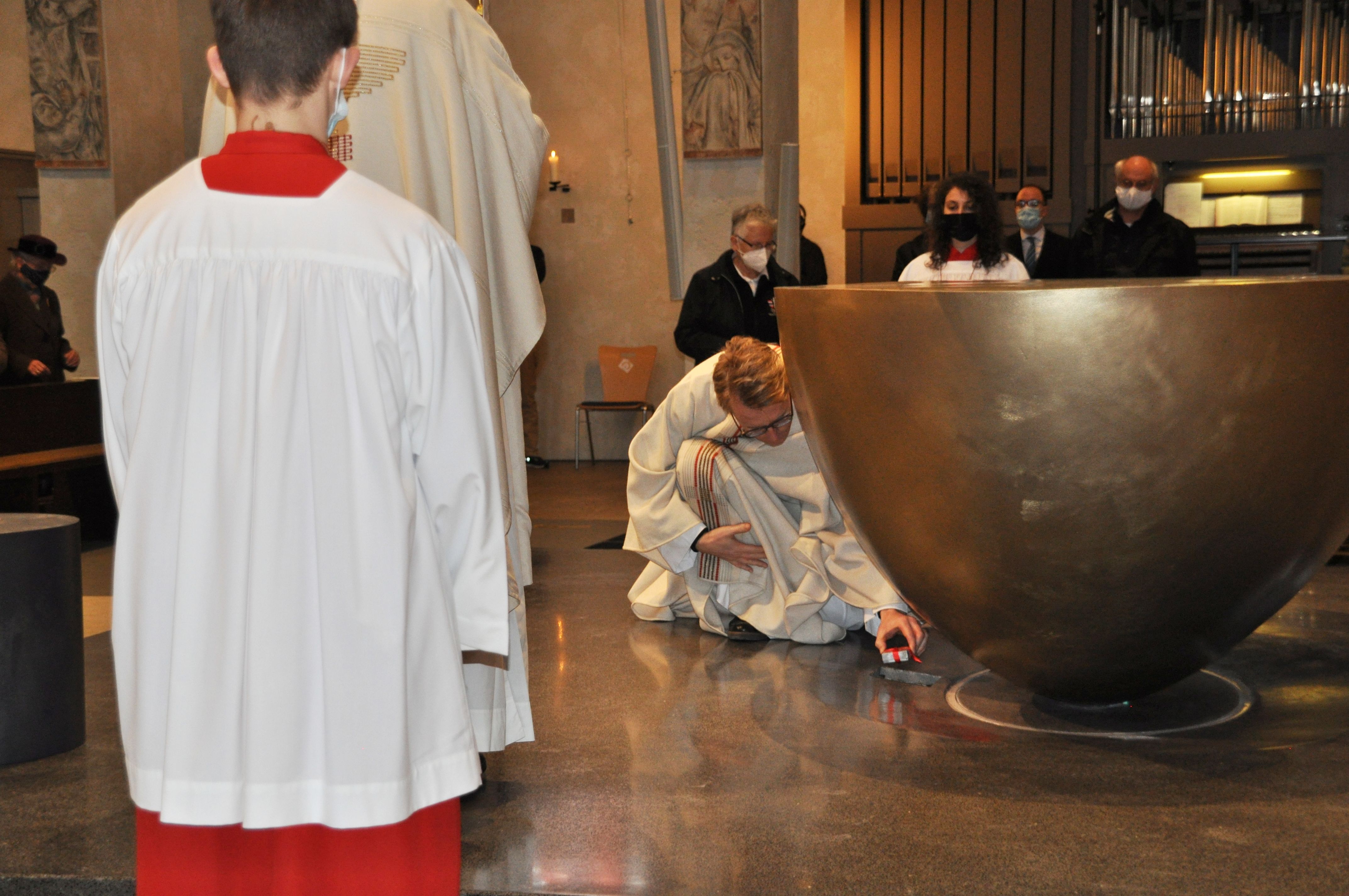 Auch die Beisetzung der Reliquien war Teil der feierlichen Altarweihe. Pfarrer Braun legte eine mit roter Schleife verschnürte Schachtel vorsichtig in die Schwelle des Altars. In der Schachtel befinden sich Reliquien der Heiligen Lioba, der Heiligen Hildegard und der Heiligen Maria Katharina Kasper. Anschließend wurde das Reliquiengrab fest verschlossen und verspachtelt.