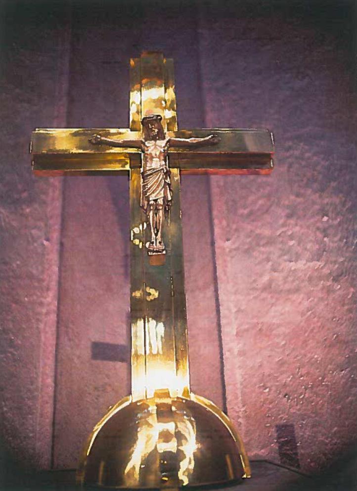 Der Erbauer der Kirche, Martin Weber, hat den Chorraum als Bild für das himmlische Jerusalem gestaltet: hell erleuchtet, mit einer großen Ewig-Licht-Ampel, vergoldetem Tabernakel und Altarkreuz. Das Ensemble ist sehr beeindruckend, vor allem wenn es gezielt beleuchtet wird. Auch mir ist dieses Bild sehr ans Herz gewachsen. Das Kreuz gehört einfach zu unserer Kirche dazu. Generationen von Gläubigen haben vor diesem Kreuz gebetet und das Knie gebeugt. Es gehört zur St.-Bonifatius-Kirche und zur Gemeinde einfach dazu.