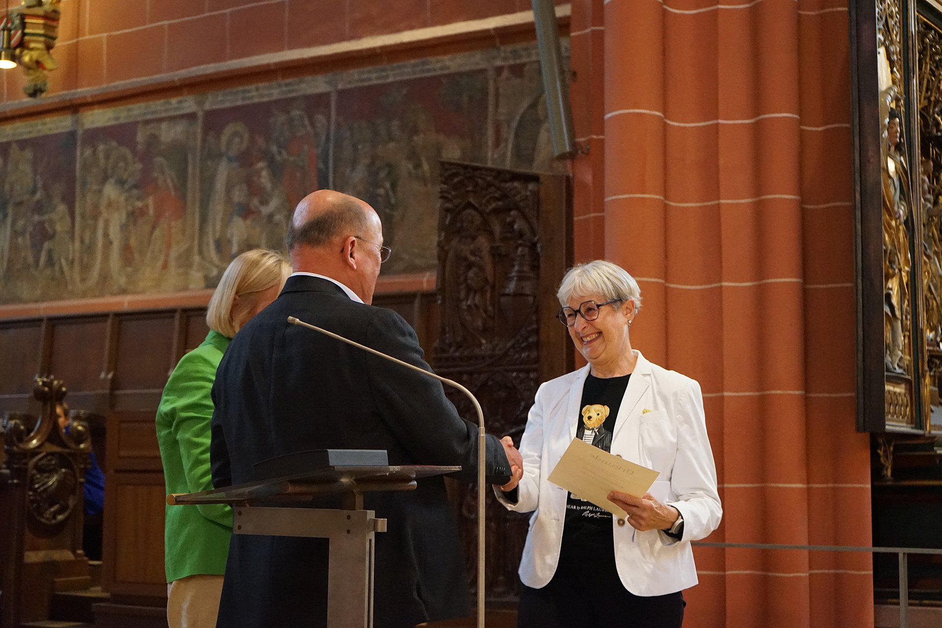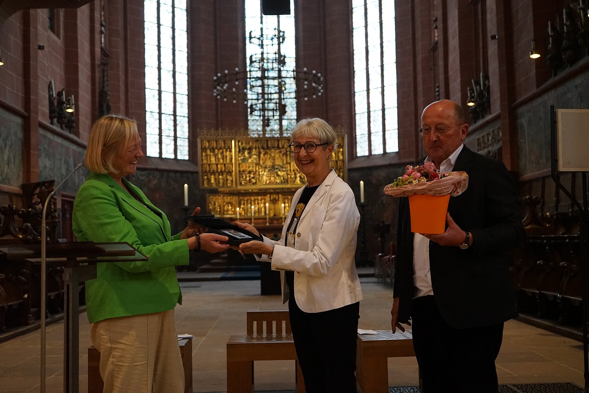 Am heutigen Sonntag nun wurde Elvira Gottschalk von der katholischen Stadtkirche Frankfurt mit der Bartholomäusplakette für herausragendes ehrenamtliches Engagement geehrt. Monika Humpert, stellvertretende Vorsitzende der Stadtversammlung der Frankfurter Katholik:innen, und Stadtdekan Johannes zu Eltz überreichten ihr die Bartholomäusplakette samt Blumen und Urkunde.