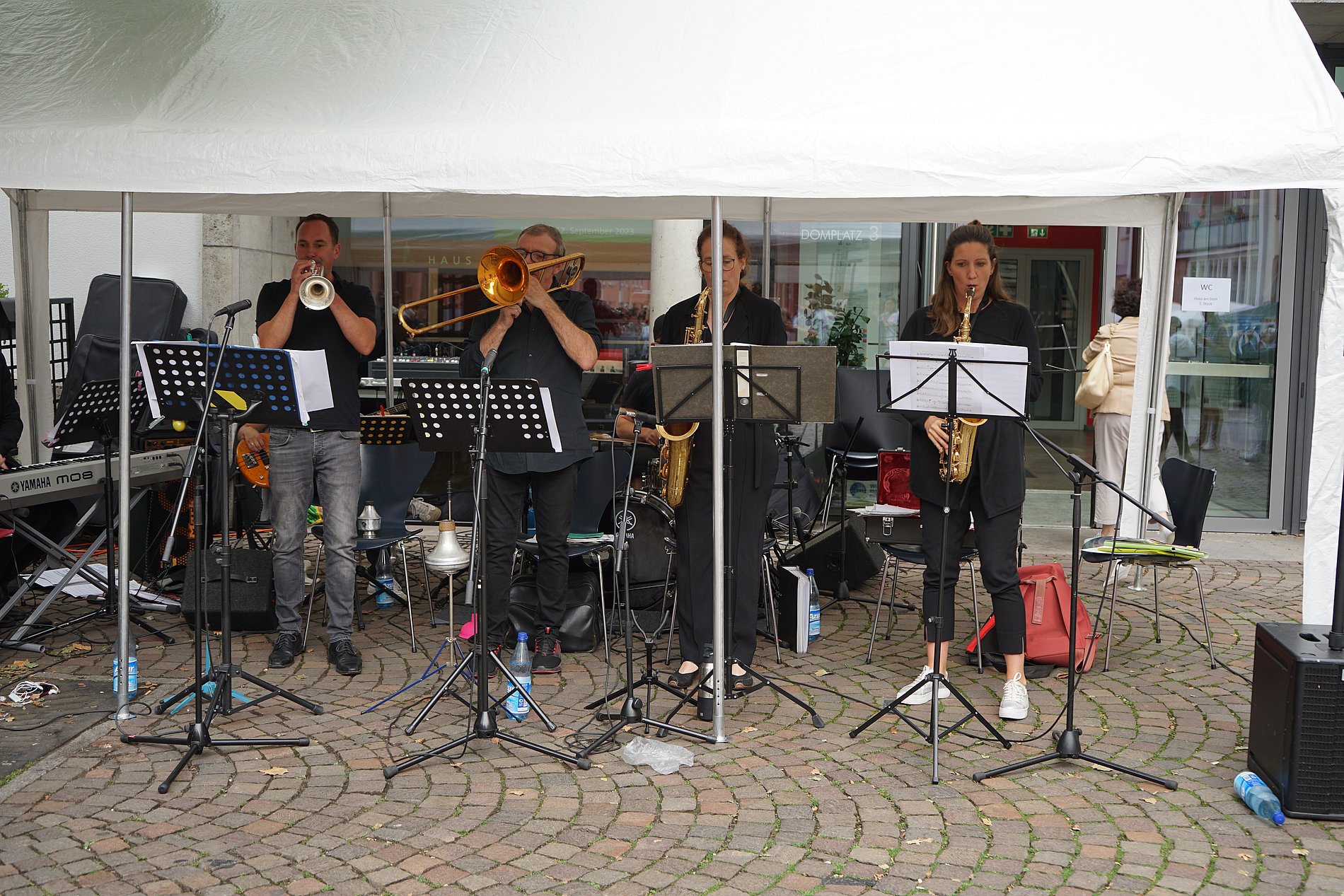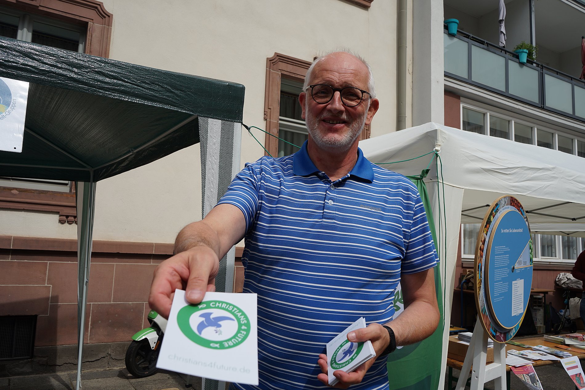 Die Plakette wird jedes Jahr im Rahmen des Stadtkirchenfestes verliehen, das am Sonntagmittag bei Essen und Getränken mit Livemusik auf dem Domplatz gefeiert wurde. Erneut nutzen zahlreiche Organisationen die Möglichkeit, die Besucherinnen und Besucher an Ständen über ihre Themen zu informieren. So wie Lutz Neumann, der für Christians4future vor Ort war. „Uns geht es darum, dass das ganze Thema Zukunft auch eine spirituelle Komponente hat und es sinnvoll ist, Gott um seine Hilfe zu bitten“, so Neumann, der im Lauf des rund dreistündigen Festes mit zahlreichen Interessierten ins Gespräch kam. Besonders gut kamen wieder die Mitmach-Aktionen an, zum Beispiel das Apfelpressen, bei dem man merkte, wie viel Arbeit und Muskelkraft in einem einzigen Glas Apfelsaft steckt, oder das Info-Rad, bei dem anhand verschiedener Lebensmittel durchdekliniert wurde, wann Lebensmittel trotz abgelaufenem Mindesthaltbarkeitsdatum noch essbar sind.