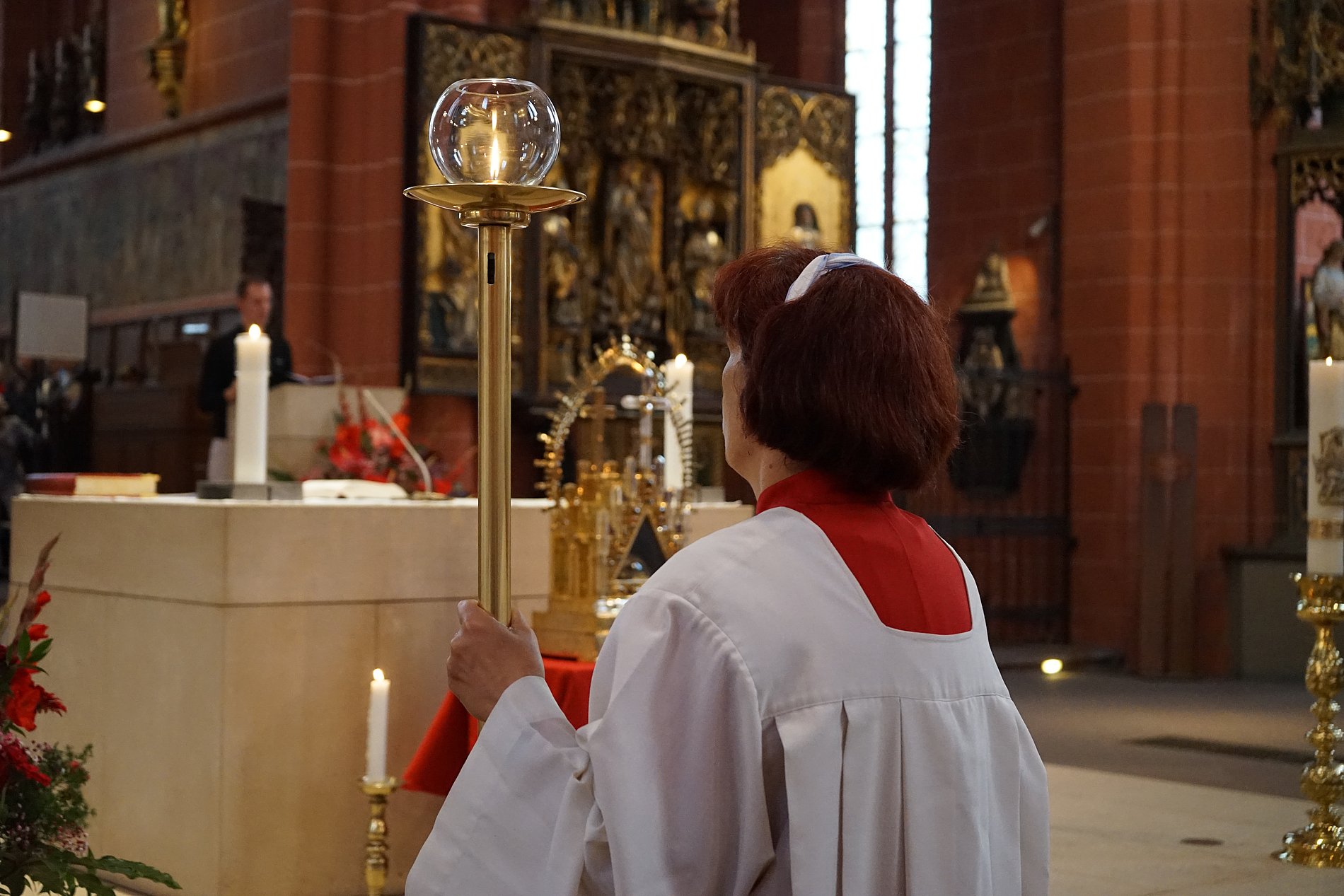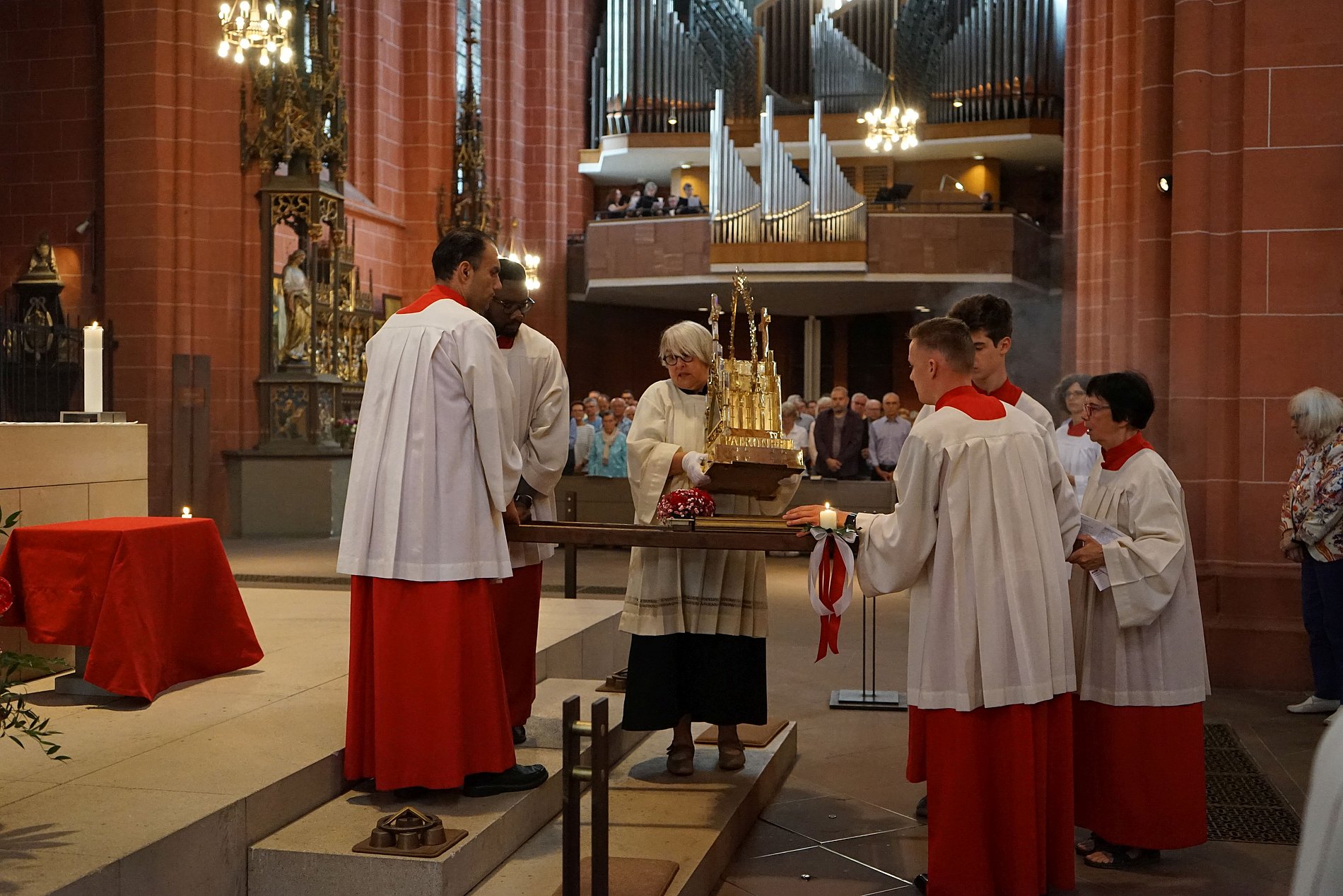 Das Stadtkirchenfest zu Ehren des Heiligen Bartholomäus hatte um 11 Uhr mit einem Festgottesdienst im nach ihm benannten Dom begonnen. Dabei wurde – auch das ist eine hochgeschätzte Tradition in Frankfurt – wieder die kostbare Reliquie des Bartholomäus präsentiert, vor der die Gläubigen beten konnten. Der Teil des Schädels wird in einem goldenen Gefäß aufbewahrt, dessen Zurschaustellung für viele Frankfurterinnen und Frankfurter ein besonderer Moment im Jahr ist. Pia Arnold-Rammé, Vorläufige Regionenvertretung der Region Frankfurt, fragte in ihrer Predigt: „Warum verehren wir einen alten Knochen, dessen Echtheit vielleicht noch nicht einmal erwiesen ist? Für mich bedeutet dieser Knochen: Real existierende Menschen haben an diesen Jesus von Nazareth geglaubt, sind ihm nachgefolgt, haben in ihrem ganz normalen Leben den Glauben bezeugt und sind sogar oft genug für ihre Überzeugung gestorben.“ Es sei kein Fantasiekonstrukt, keine reine Weisheitslehre, dieser Glaube. „Sondern er hat sich in der Geschichte ereignet und tut dies bis heute. Er wurde von ganz konkreten Menschen in der Geschichte bezeugt; er existiert wirklich, in der Geschichte von Menschen, die real sind, mit Haut und Knochen.“ So wie es dieser Schädel des Bartholomäus demonstriere: „Und das gibt mir Kraft und Stärke für mein Leben, für meinen Glauben.“ Wegen Krankheit konnte Pia Arnold-Rammé ihre Predigt nicht selbst halten, stattdessen wurde sie von ihrer Kollegin Jutta Fechtig-Weinert vorgetragen.