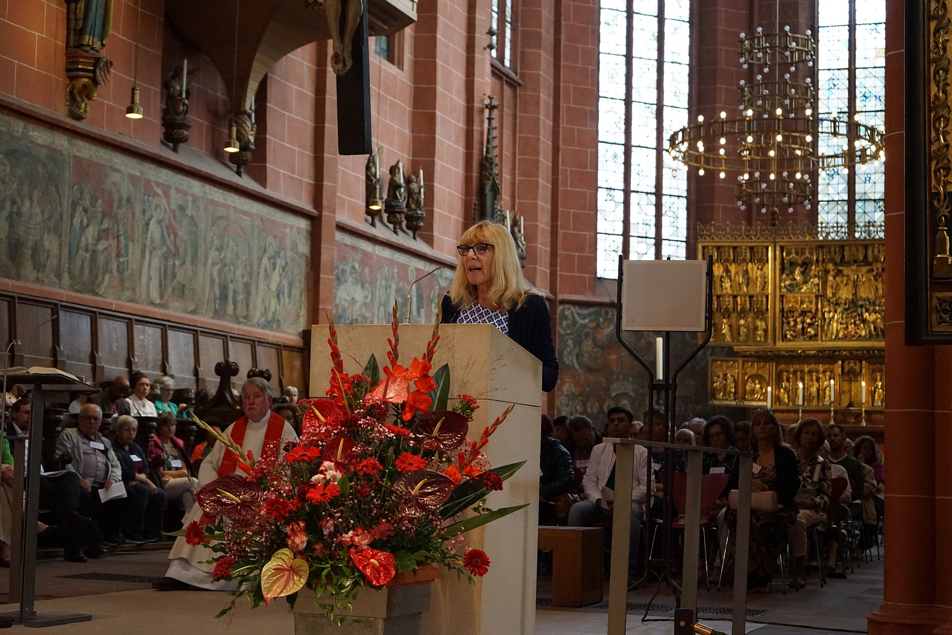 Zunächst einmal stehe ich hier, weil ich die Übergangsregionenvertreterin bin - ein ganz toller Titel! Das heißt, ich habe Leitungsverantwortung für die Stadtkirche übernommen. Das habe ich gern gemacht, weil diese Stadtkirche mir sehr am Herzen liegt. Und deshalb finde ich es auch toll, heute hier zu sein, denn der volle Dom ist für mich Ausdruck dafür, dass ich damit nicht alleine stehe. Die Stadtkirche lebt durch all die vielen Menschen, die sich in ihr engagieren als Christen und Christinnen, in ganz unterschiedlichen Bereichen und Aufgaben. Das ist klasse und allein ein Grund zum Feiern.