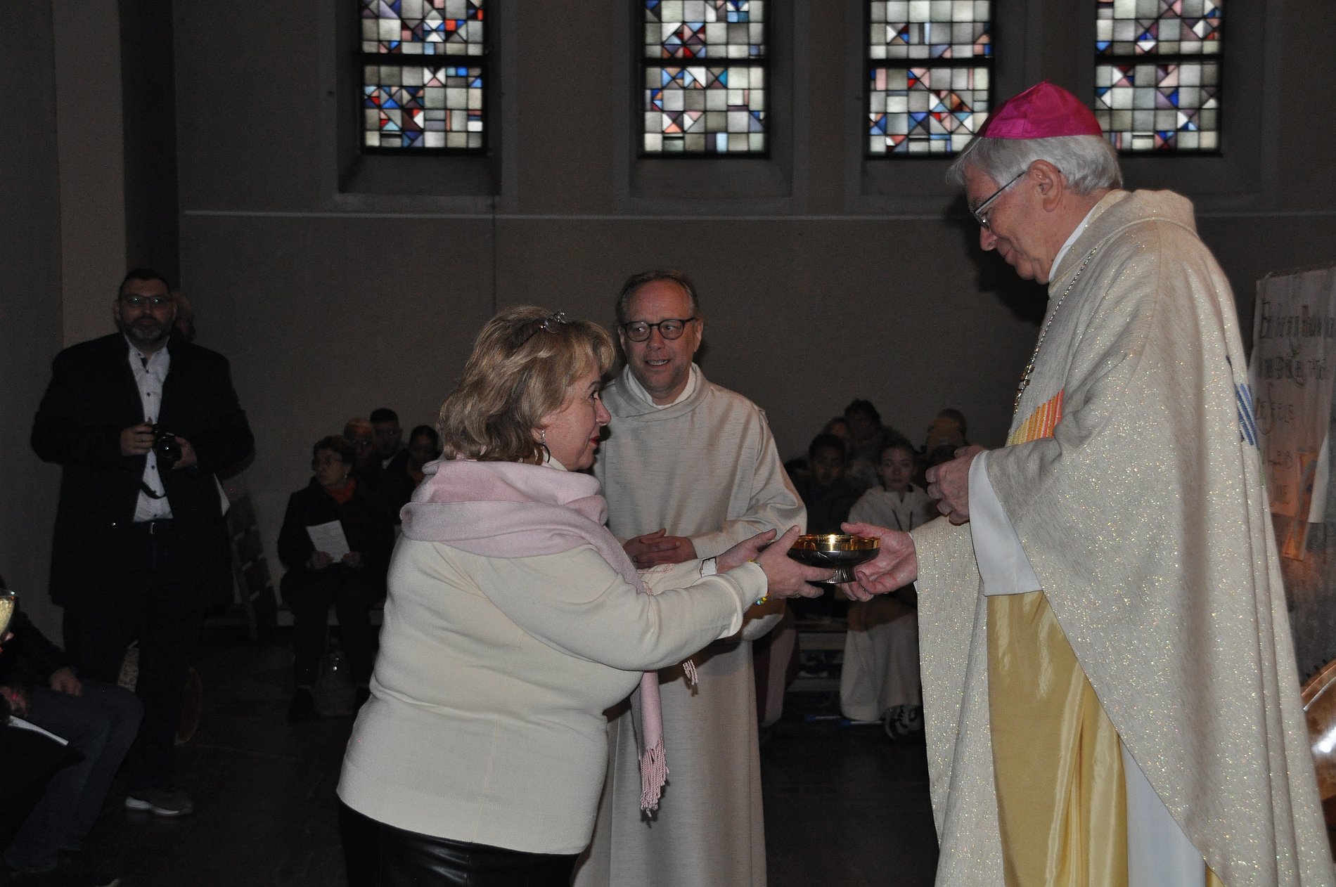 Der Weihbischof zog in seiner Predigt immer wieder Parallelen zum Leben der großen Namenspatronin: „Beim Lesen der Gründungsvereinbarung der neuen Pfarrei kam mir Hildegard immer wieder in den Sinn. Die Vereinbarung baut auf einem durchdachten Pastoralkonzept auf, nahe am Leben und an aktuellen Herausforderungen. Es blickt auf die Situation der Pfarrei. Es geht um kirchliches Leben insgesamt. Und es geht um das Leben der Menschen im Stadtteil, in der Großstadt Frankfurt mit allen Facetten der Gegenwart. Als Beispiele seien nur genannt das ,Projekt Schwul und Katholisch‘, die Basisgemeinde und das ökumenische Zentrum Pax&People im Europaviertel“, sagte Löhr.