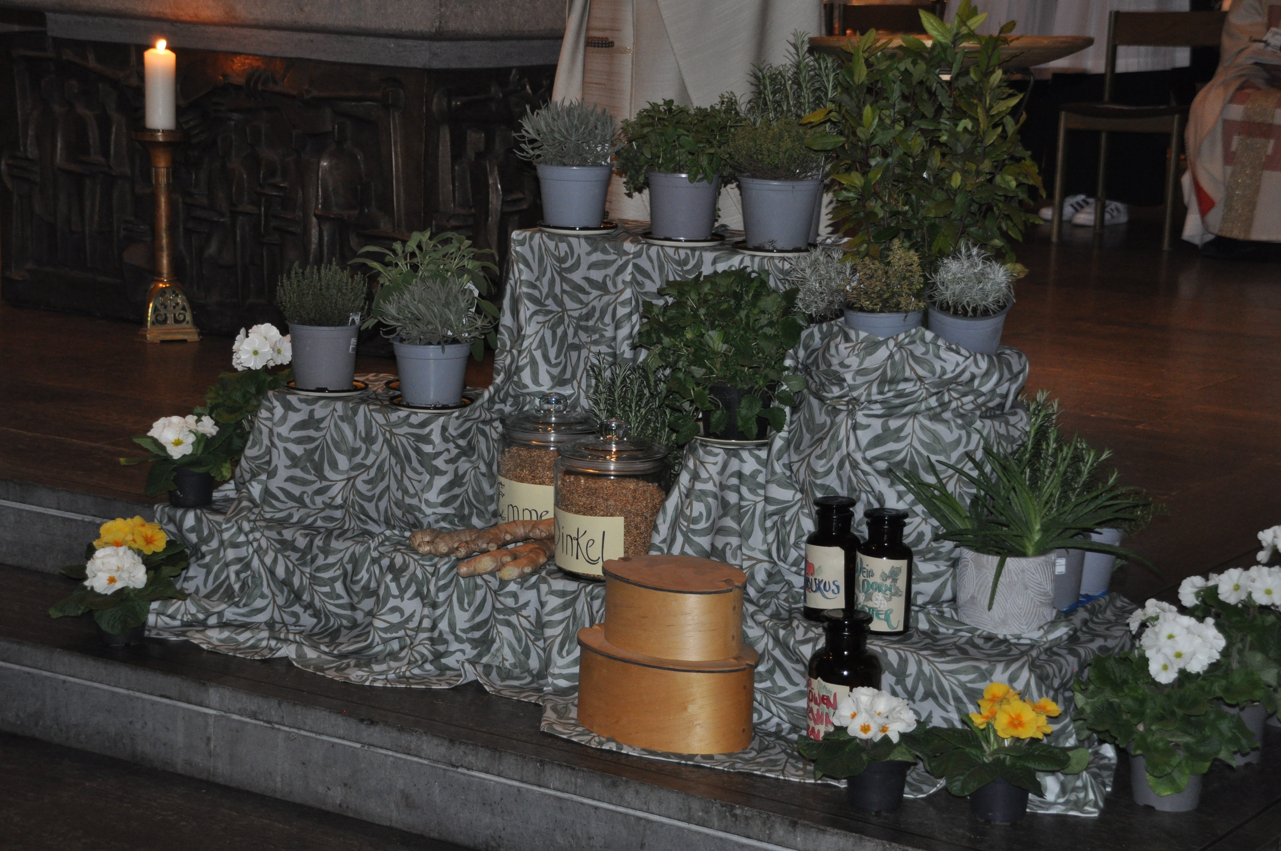 Es war eine feierliche Prozession, in der Vertreterinnen und Vertreter aller sieben Kirchorte und eine Vertreterin der muttersprachlichen Gemeinden goldene Schalen zum Altar trugen. In den Gefäßen lagen getrocknete Blüten, lila, senfgelb und blassgrün. Es handelte sich um sieben Kräuter aus den sieben Kirchorten, die künftig die neue Pfarrei St. Hildegard bilden und die symbolisch am Altar zusammengeschüttet wurden. Sieben Kräuter, das sind in Frankfurt ja klassischerweise Petersilie, Schnittlauch, Boretsch, Sauerampfer, Kresse, Pimpinelle und Kerbel – doch in diesem Fall waren die Kräuter nicht für die Grüne Soße, sondern die Teetasse bestimmt. „Deshalb haben wir uns für eine süßere Mischung entschieden“, sagte eine Helferin: Ringelblumenblüten, Kornblumenblüten, Hibiskus, Apfelminze, Holunderblüten, Hagebuttenschalen und Himbeerblätter. Entsprechend stand auch auf den Beutelchen, das jede Besucherin und jeder Besucher sich am Ausgang abholen konnte: „Bunte Mischung – 7-Gemeinden-Kräutertee“. Und hintendrauf der augenzwinkernde Zusatz: „Maximal zehn Minuten ziehen lassen und probieren, ob’s schmeckt.“
