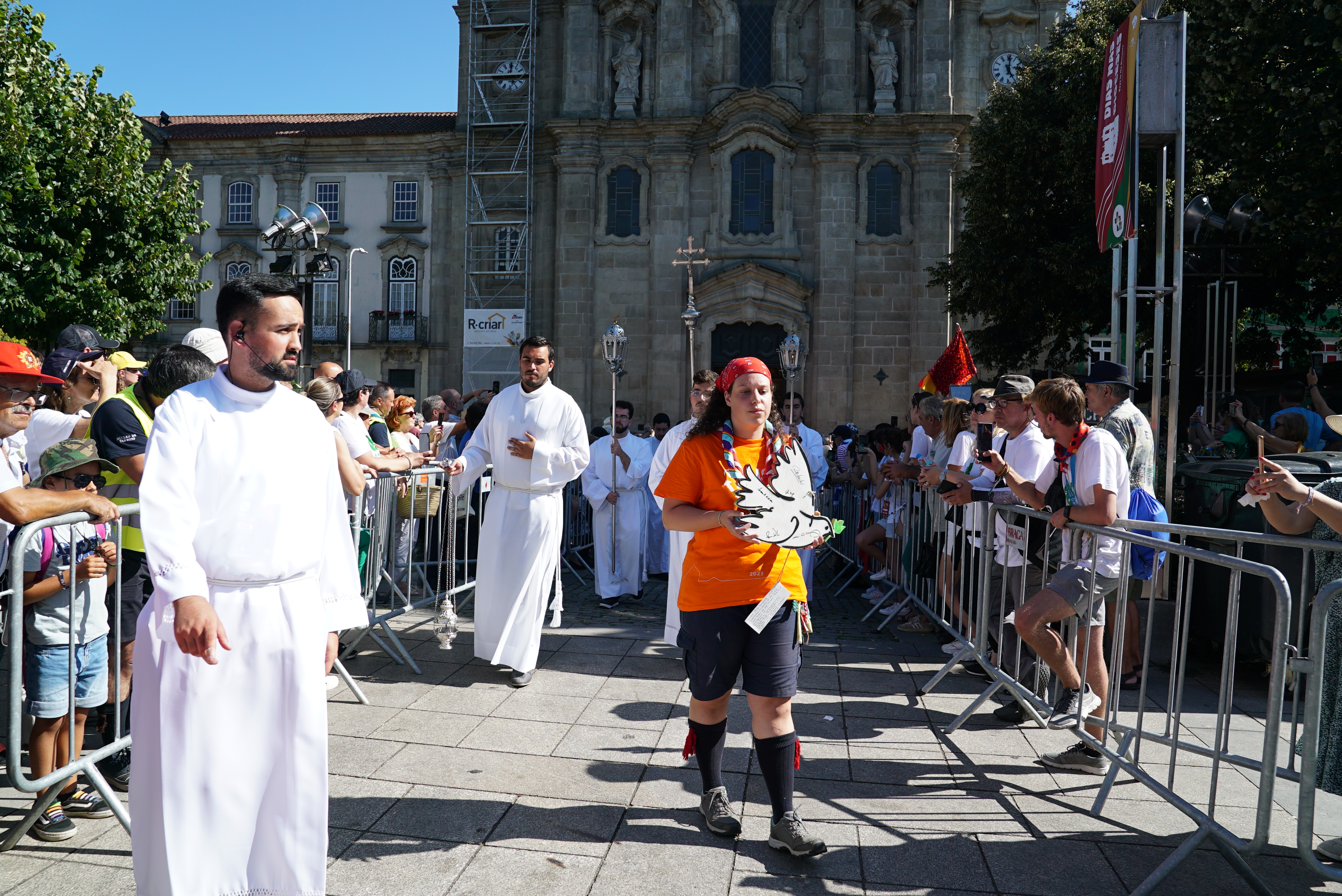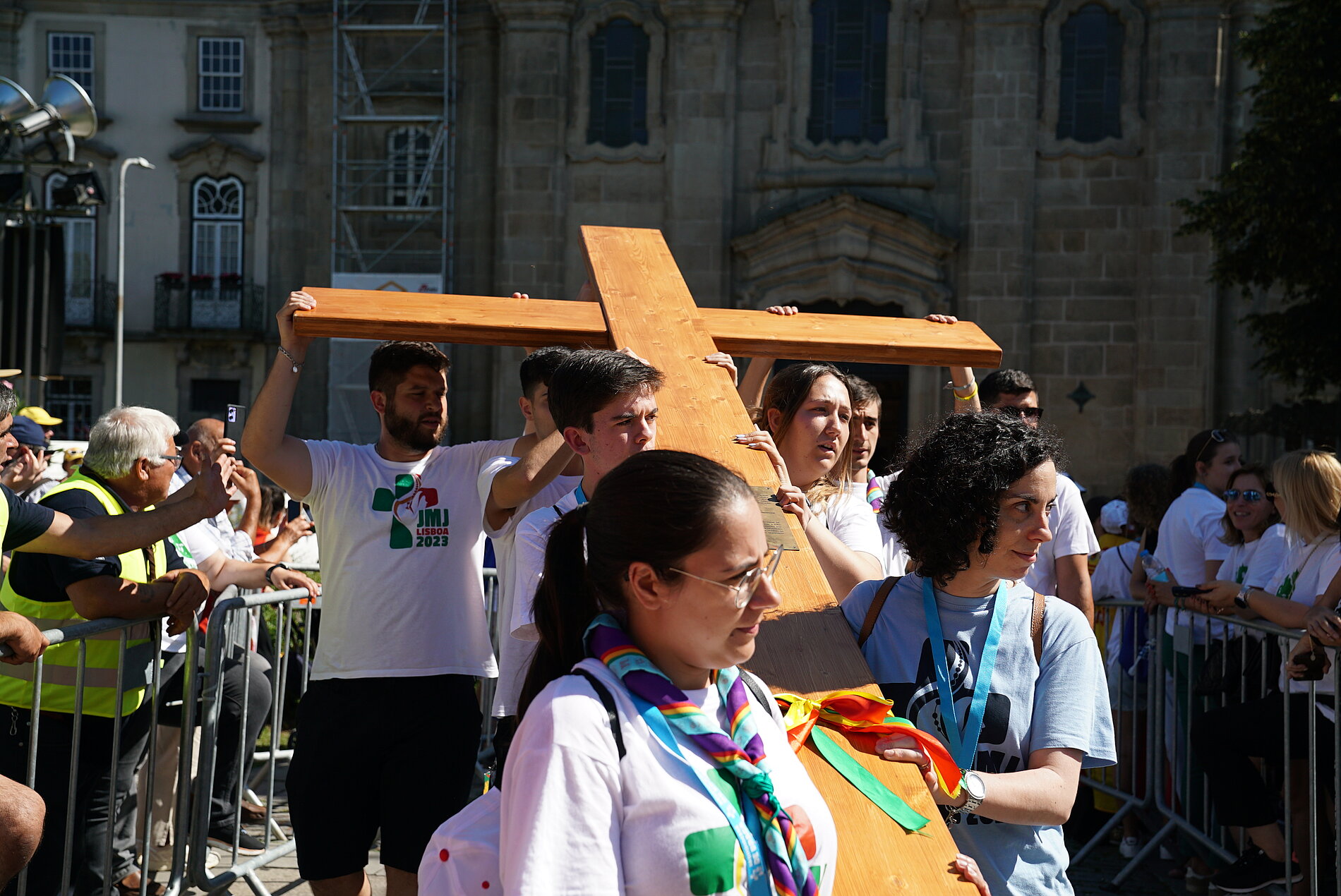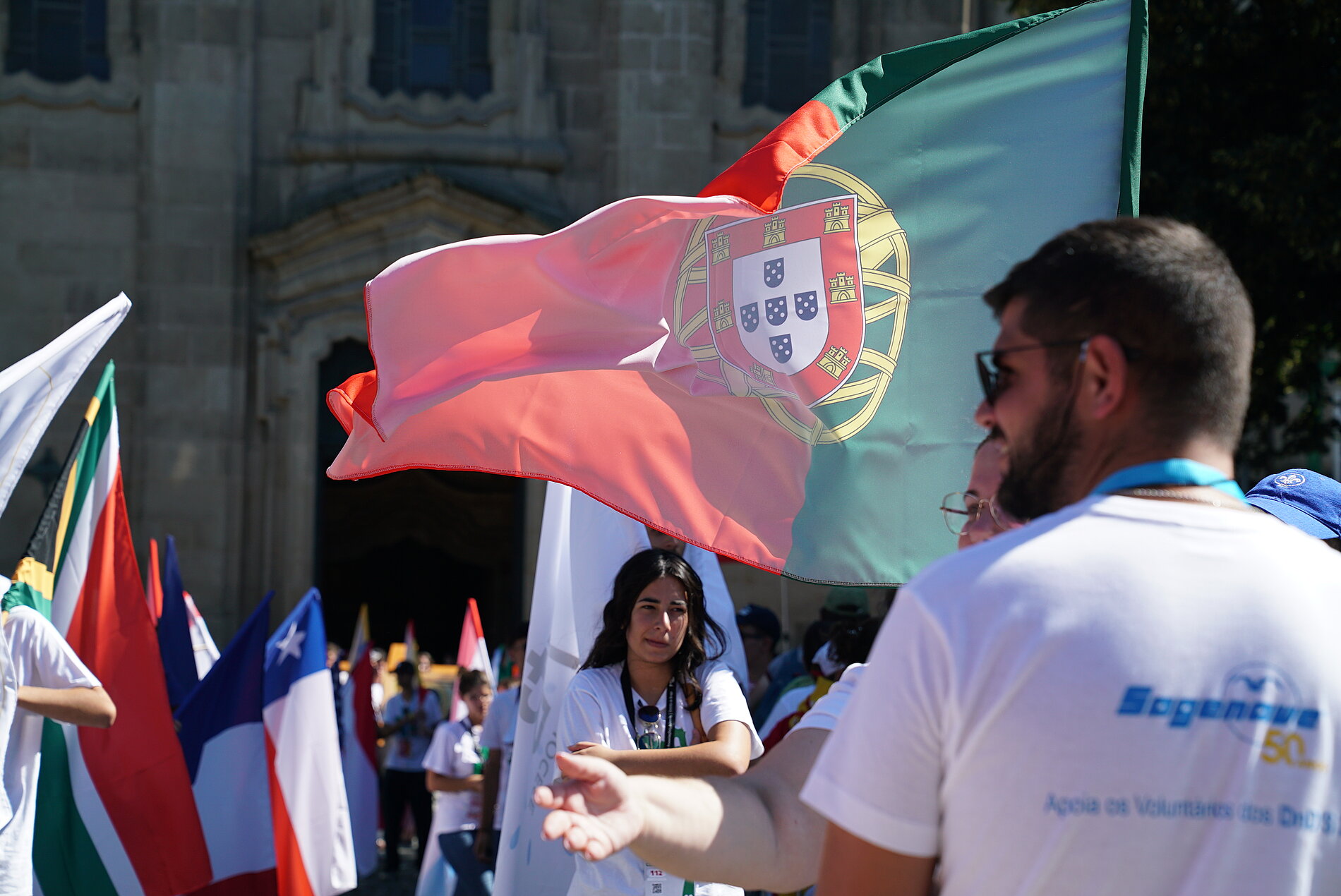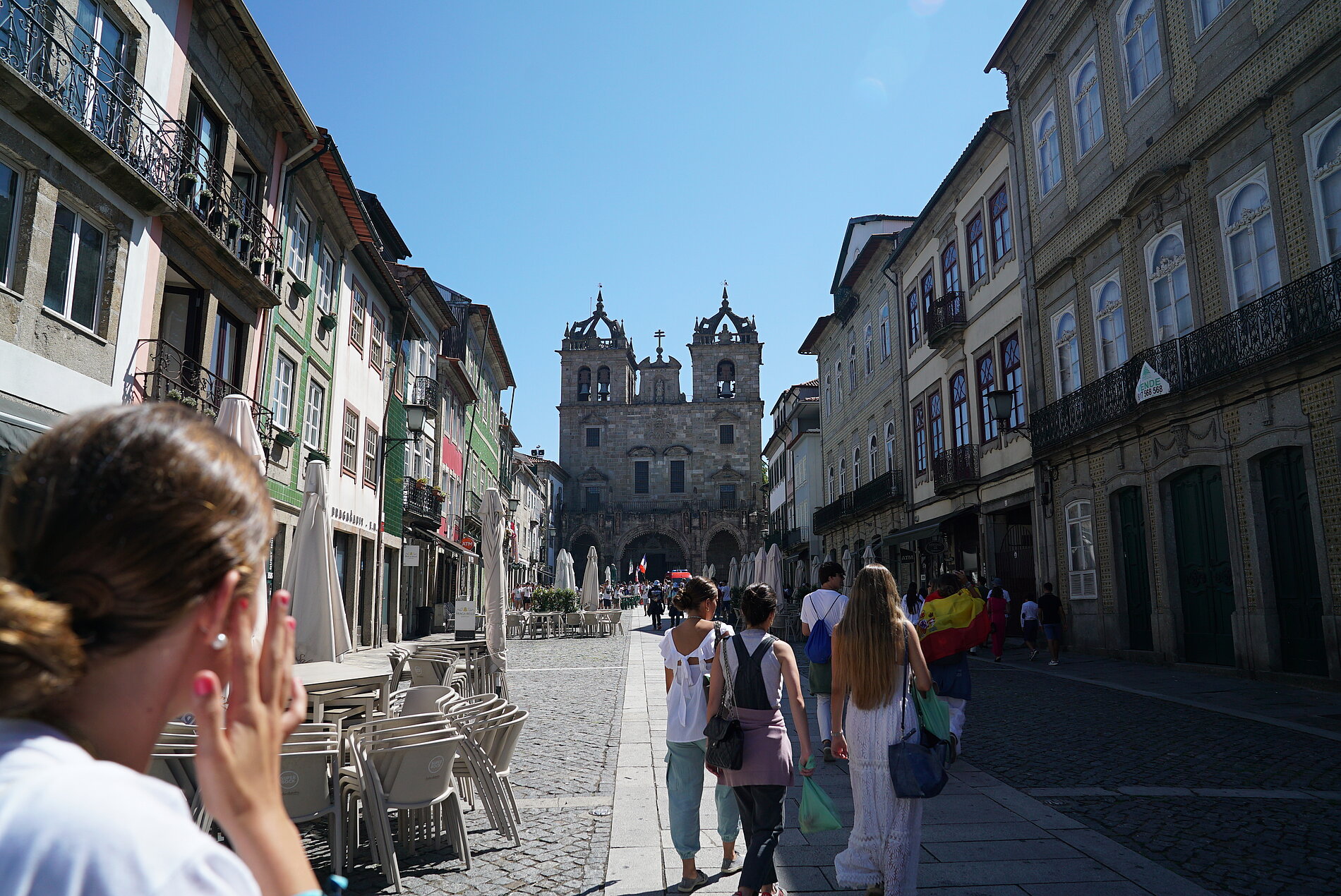 Für Leni (17), Giulia (21) und Klara (17) aus der Pfarrei Heilige Familie Untertaunus ist es der erste Weltjugendtag. „Ich habe mich zum Weltjugendtag angemeldet, um den Glauben gemeinsam mit anderen Jugendlichen zu feiern“, erzählt Giulia. „Ich habe vom Weltjugendtag in Panama Videos gesehen und dann wollte ich gerne dabei sein.“ Für Klara ist Portugal auch ein Land, das sie vorher noch nicht besucht hat. „Die Aktivitäten hier vor Ort und mit der Gruppe gefallen mir auch gut“, sagt sie. Die Gruppe besuchte beispielsweise das Heiligtum von Sao Bento – der zweitgrößte Pilgerort in Portugal, zu dem jährlich etwa zwei Millionen Menschen pilgern und feierte auch einen Gottesdienst mit etwa 9.000 Pilgerinnen und Pilgern sowie dem Erzbischof von Braga.
