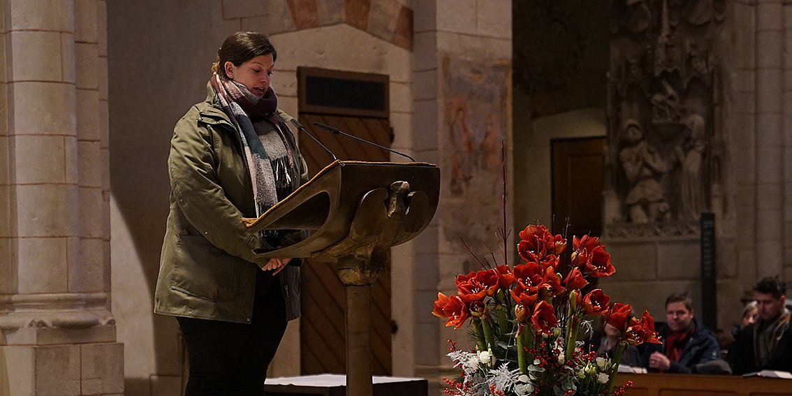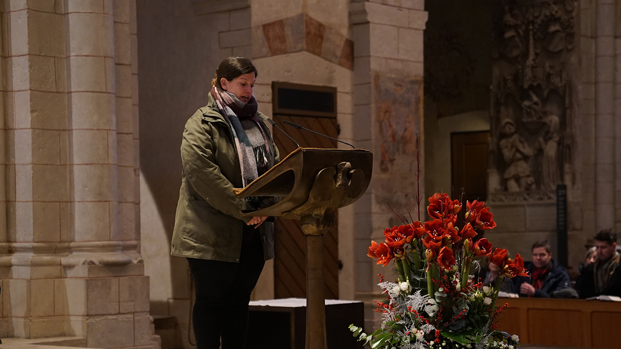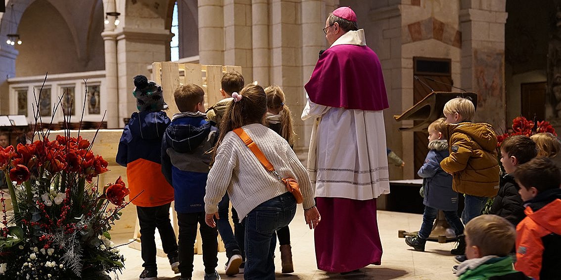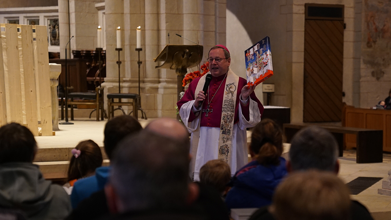 Während die Türchen des Adventskalenders geöffnet waren, war die Holztür vor dem Altar noch verschlossen. Der Limburger Bischof bat die Kinder um Hilfe zur Öffnung. Hinter der Tür, die vor dem Altar stand, lag das Jesuskind in der Krippe.