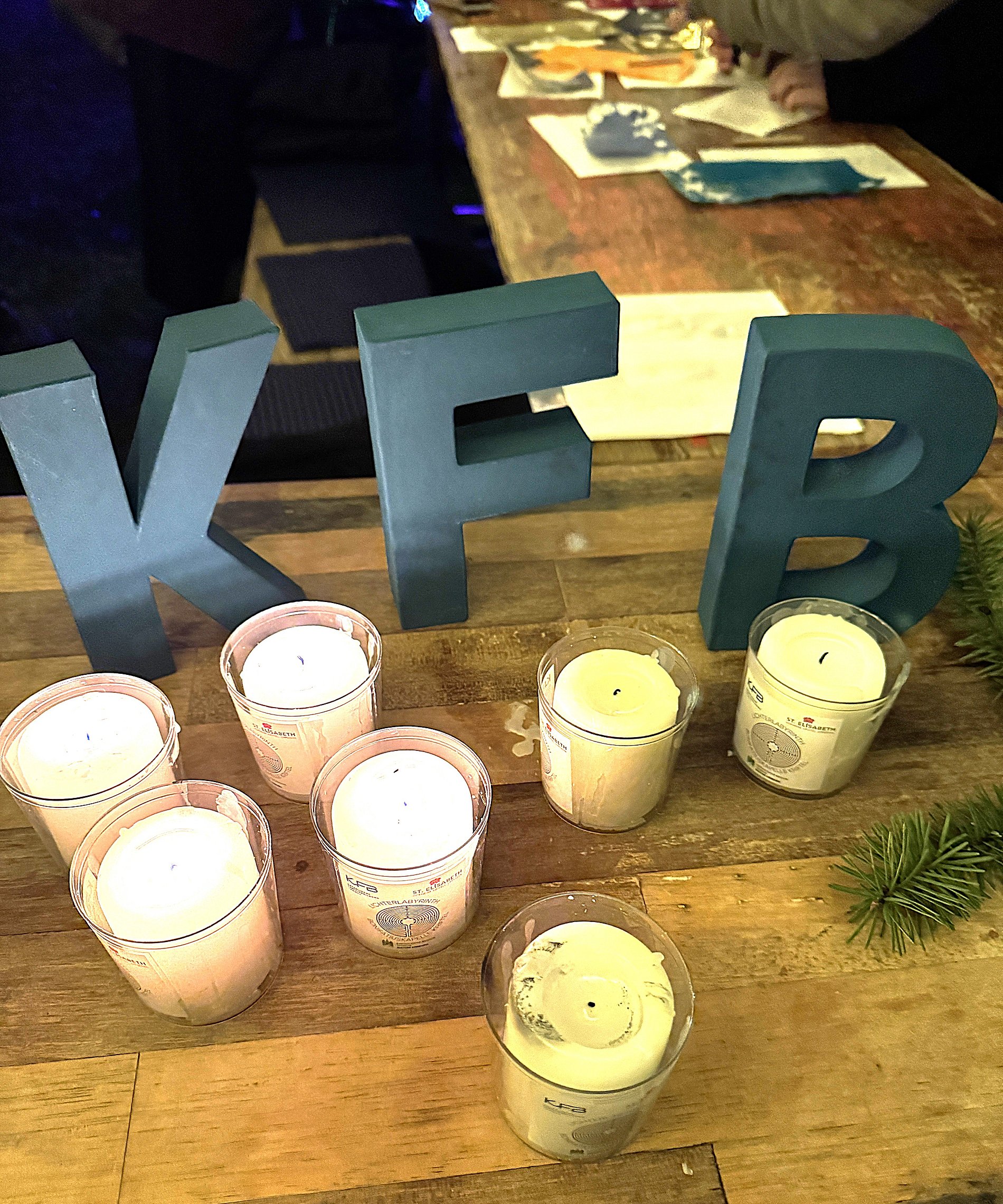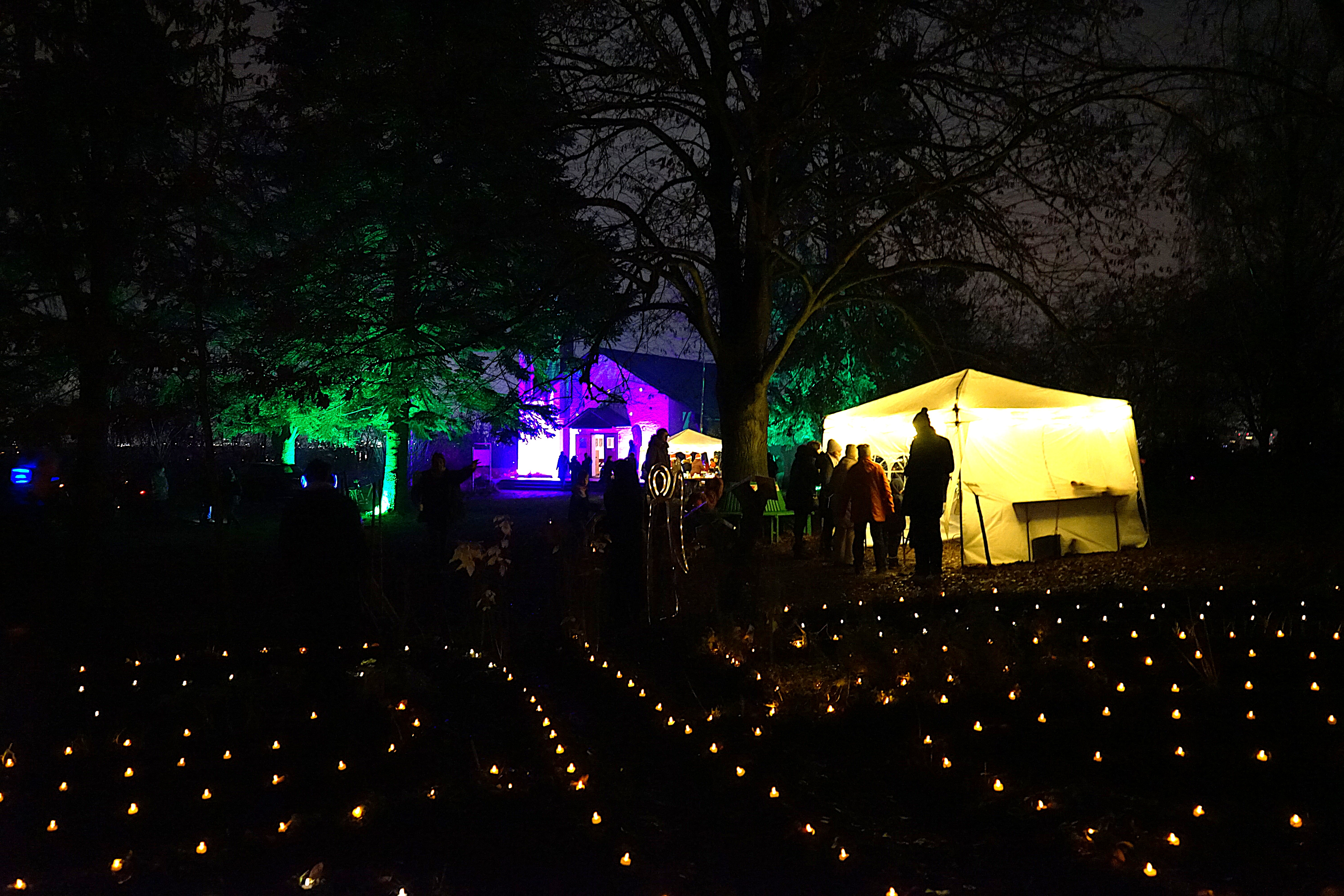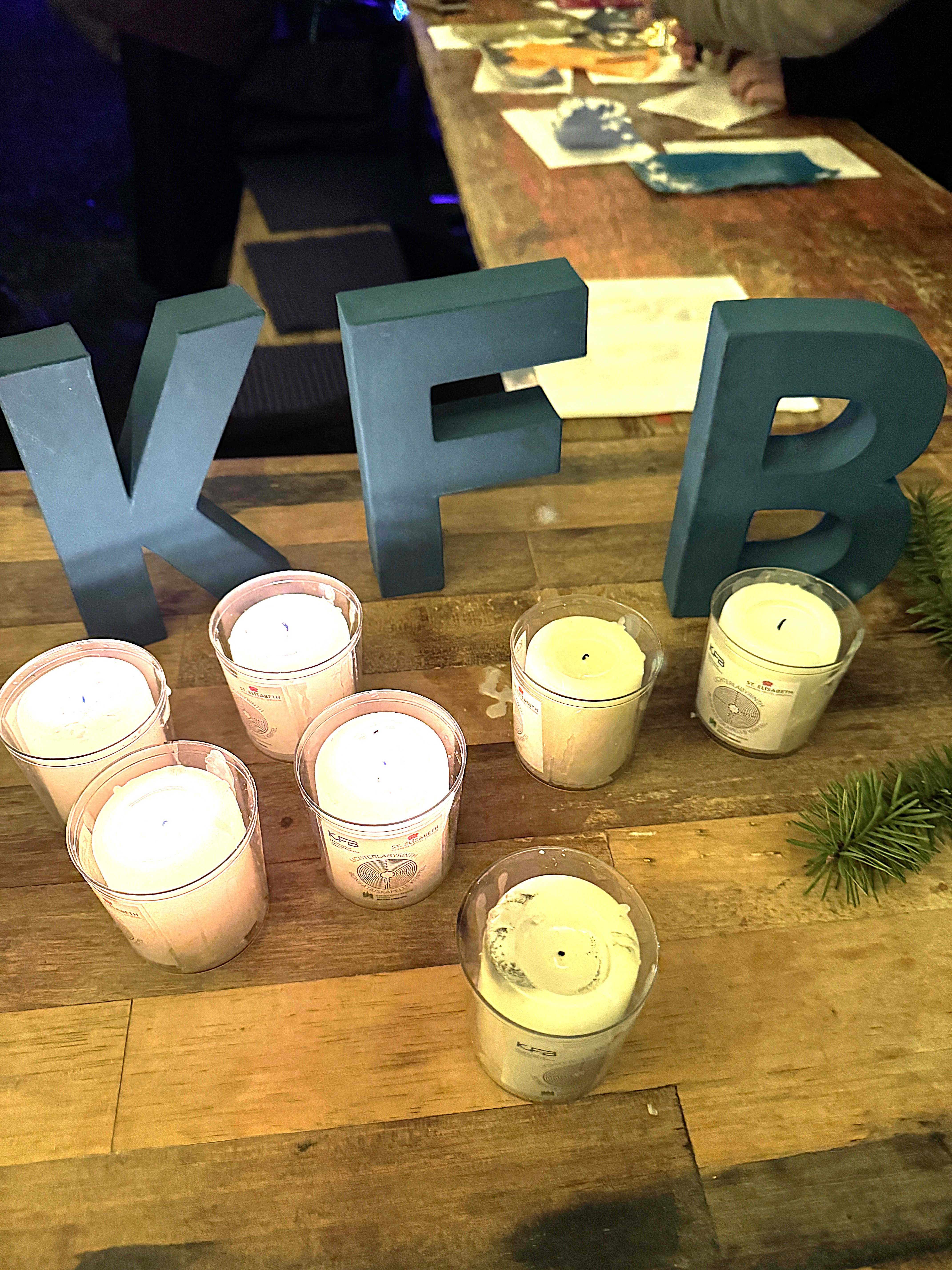 Doch es gab noch mehr zu erleben auf dem weitläufigen Gelände rund um die Bonifatiuskapelle. An zwei Lagerfeuern wurden Stockbrote über die Flammen gehalten, unter einem Zeltdach saßen viele gemütlich beisammen und wärmten sich mit heißen Getränken. Vor der stimmungsvoll illuminierten Kapelle hatte die Katholische Familienbildung Taunus (KFB) einen Stand aufgebaut. Dort konnten nicht nur die, die das Friedenslicht mit heimnehmen wollten, eine Kerze nehmen, sondern sie auch selbst gestalten. Wachsplatten und Werkzeug lagen aus, so dass man seiner Kreativität freien Lauf lassen konnte. Am Eingang des Geländes begrüßte René Kersting, Leiter der KFB Taunus, die Besuchenden und erklärte ihnen das Angebot. Besonders freute ihn, dass viele Familien zum ersten Mal im Gartenlabyrinth vorbeischauten.