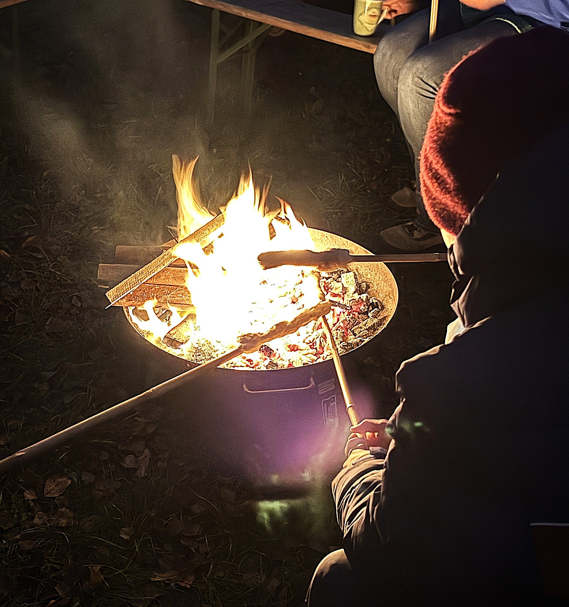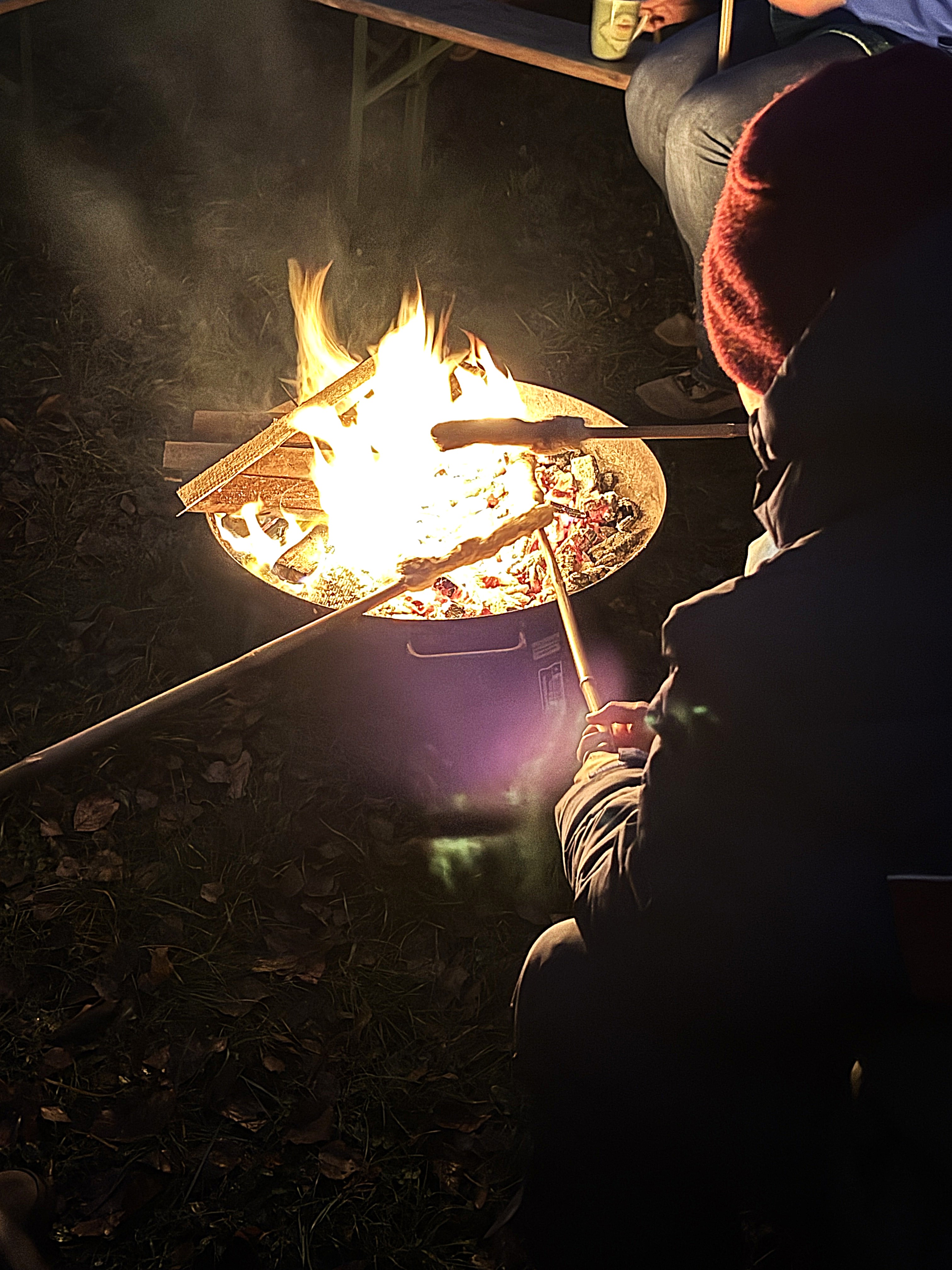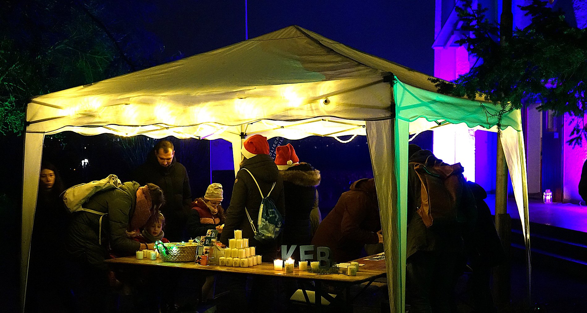 Doch es gab noch mehr zu erleben auf dem weitläufigen Gelände rund um die Bonifatiuskapelle. An zwei Lagerfeuern wurden Stockbrote über die Flammen gehalten, unter einem Zeltdach saßen viele gemütlich beisammen und wärmten sich mit heißen Getränken. Vor der stimmungsvoll illuminierten Kapelle hatte die Katholische Familienbildung Taunus (KFB) einen Stand aufgebaut. Dort konnten nicht nur die, die das Friedenslicht mit heimnehmen wollten, eine Kerze nehmen, sondern sie auch selbst gestalten. Wachsplatten und Werkzeug lagen aus, so dass man seiner Kreativität freien Lauf lassen konnte. Am Eingang des Geländes begrüßte René Kersting, Leiter der KFB Taunus, die Besuchenden und erklärte ihnen das Angebot. Besonders freute ihn, dass viele Familien zum ersten Mal im Gartenlabyrinth vorbeischauten.