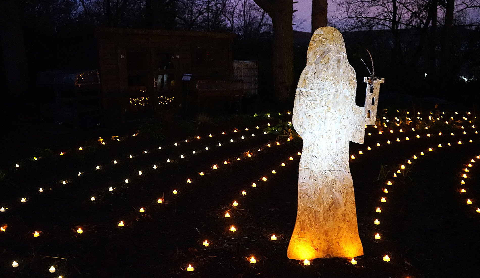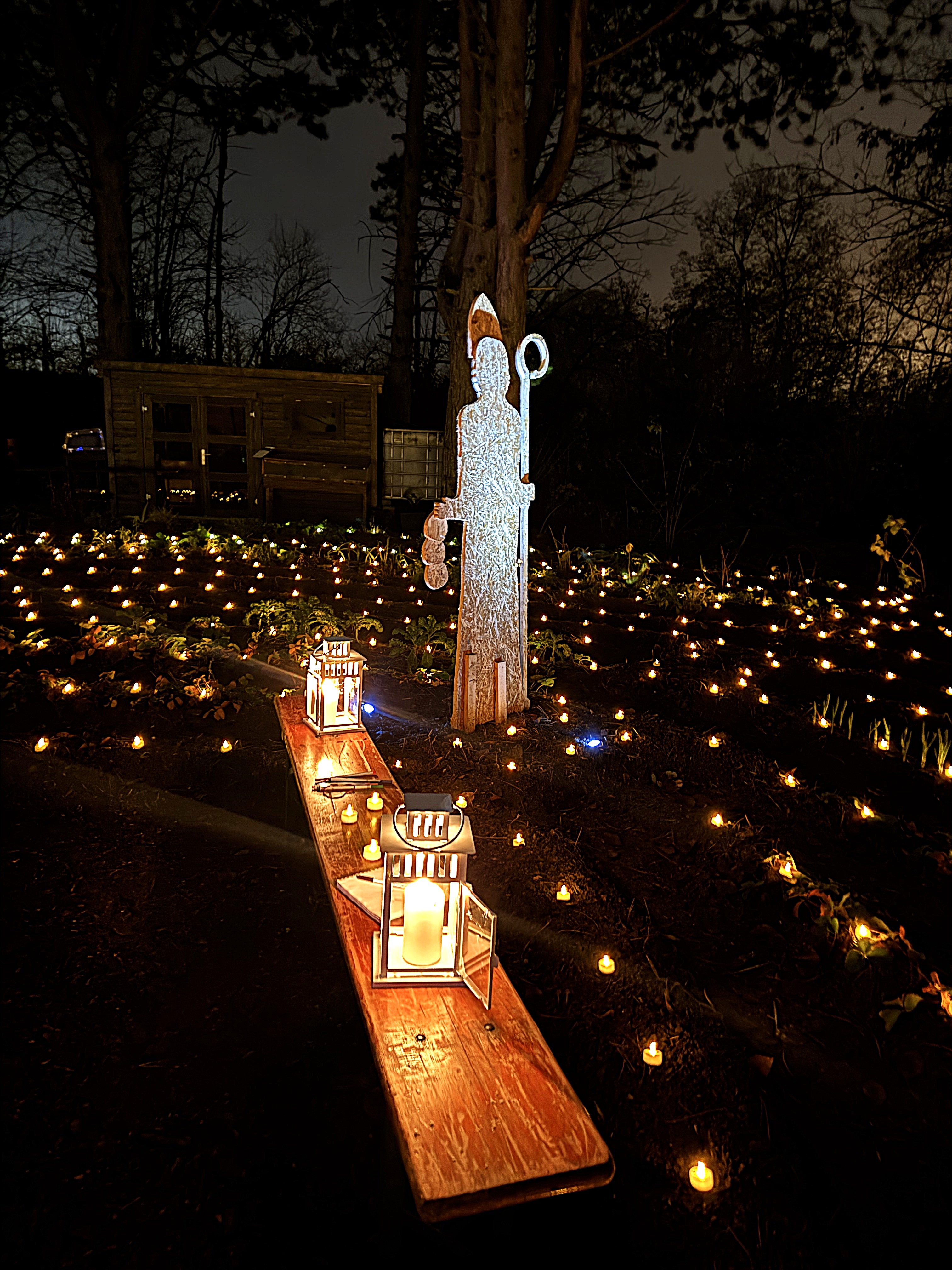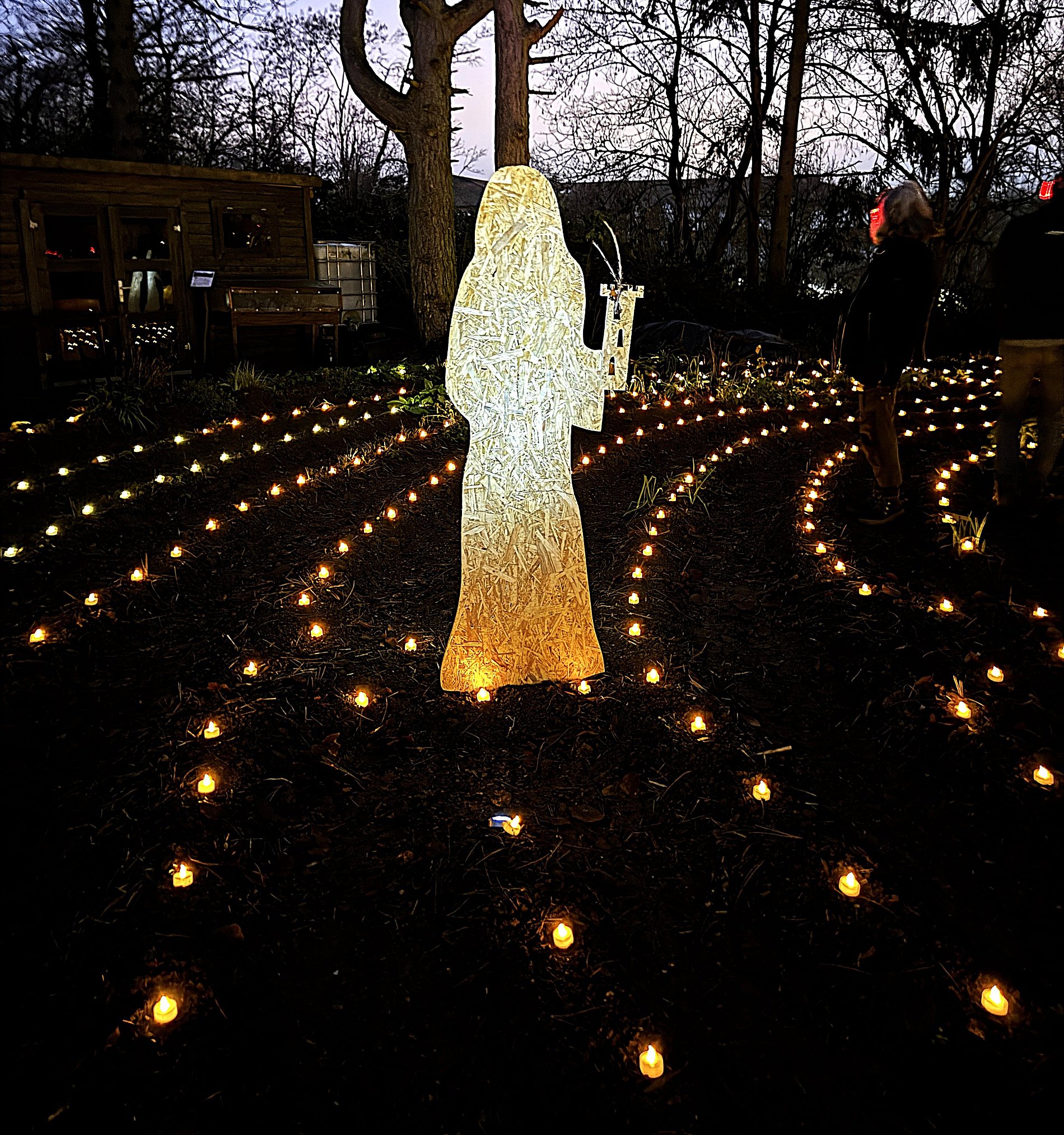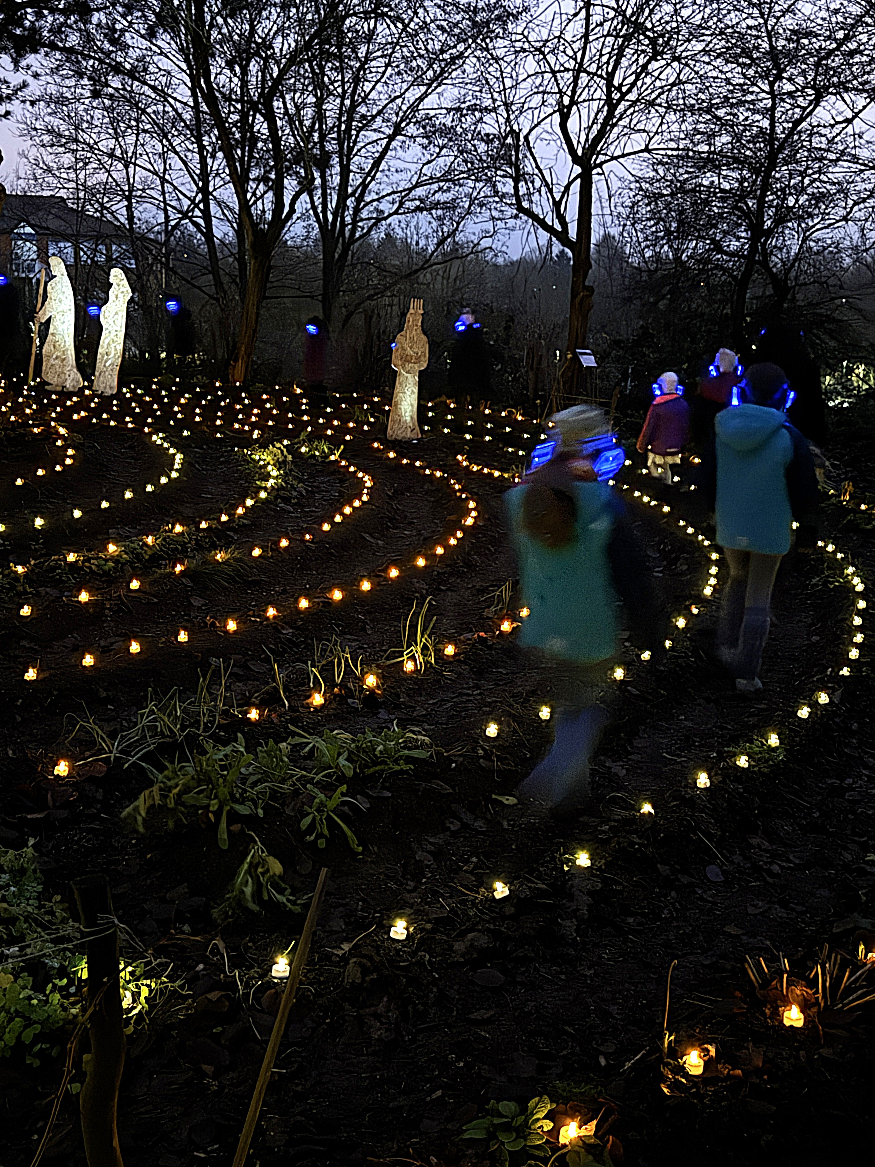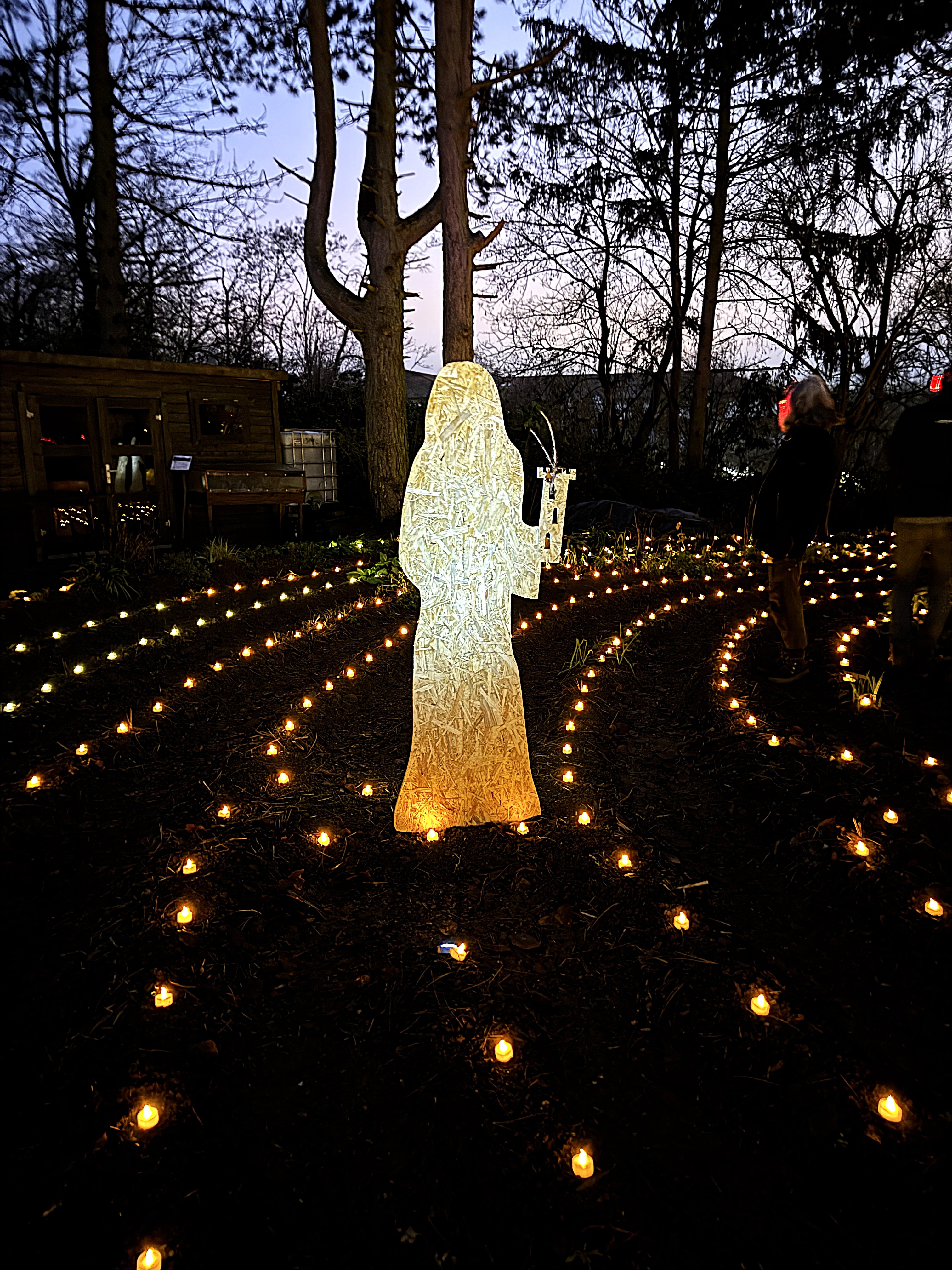 Im Lichterlabyrinth wurden neben den über tausend kleinen Lämpchen auch mehrere Heiligendarstellungen aus Holzschnitt aufgebaut. Eine 25-köpfige Pilgergruppe um Hans-Peter Labonte hatte nachmittags rund eine Stunde für den Aufbau gebraucht. Die Mühe hatte sich gelohnt, denn nun ging man auf dem beleuchteten Weg an der heiligen Barbara, dem heiligen Nikolaus und der heiligen Luzia vorbei. Auch begegneten den Besuchenden Figuren von Maria und Josef auf ihrem Weg nach Bethlehem. Zum Abschluss feierte Schwester Nathalie Korf CJ mit der Gemeinde noch eine Taizéandacht. Der Wunsch nach Frieden stand im Mittelpunkt des Gebets mit Gesang.