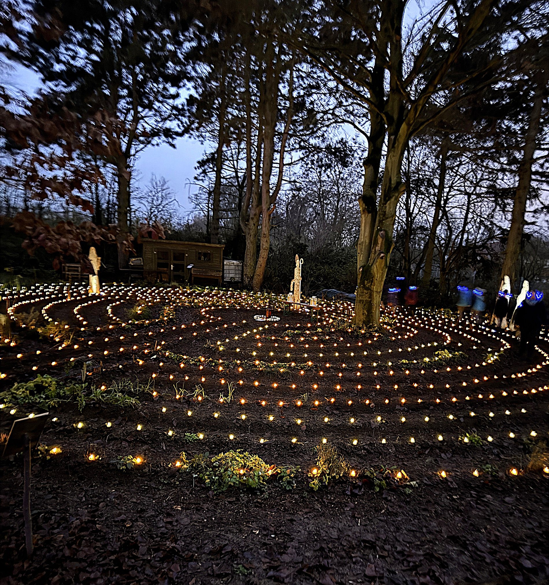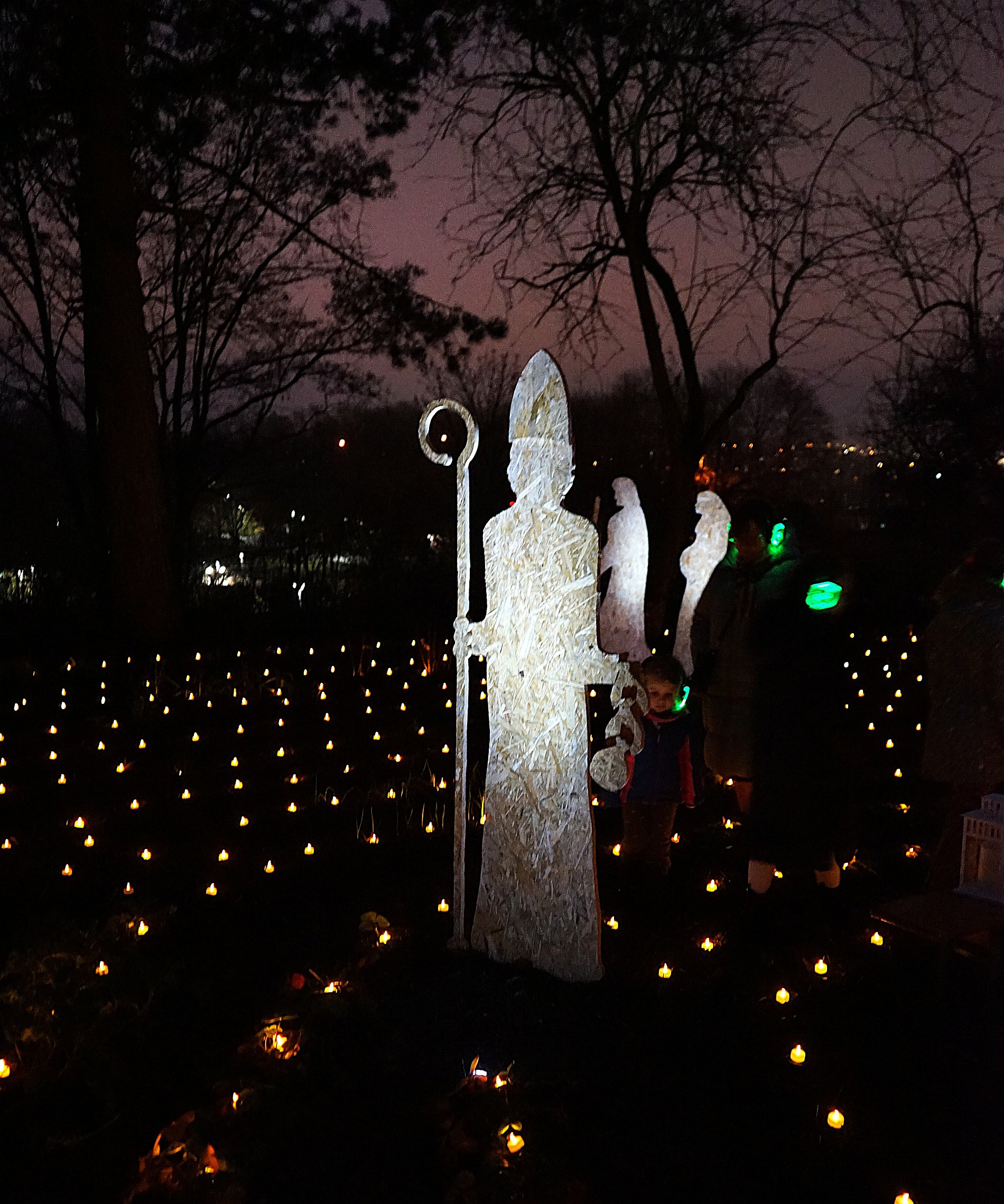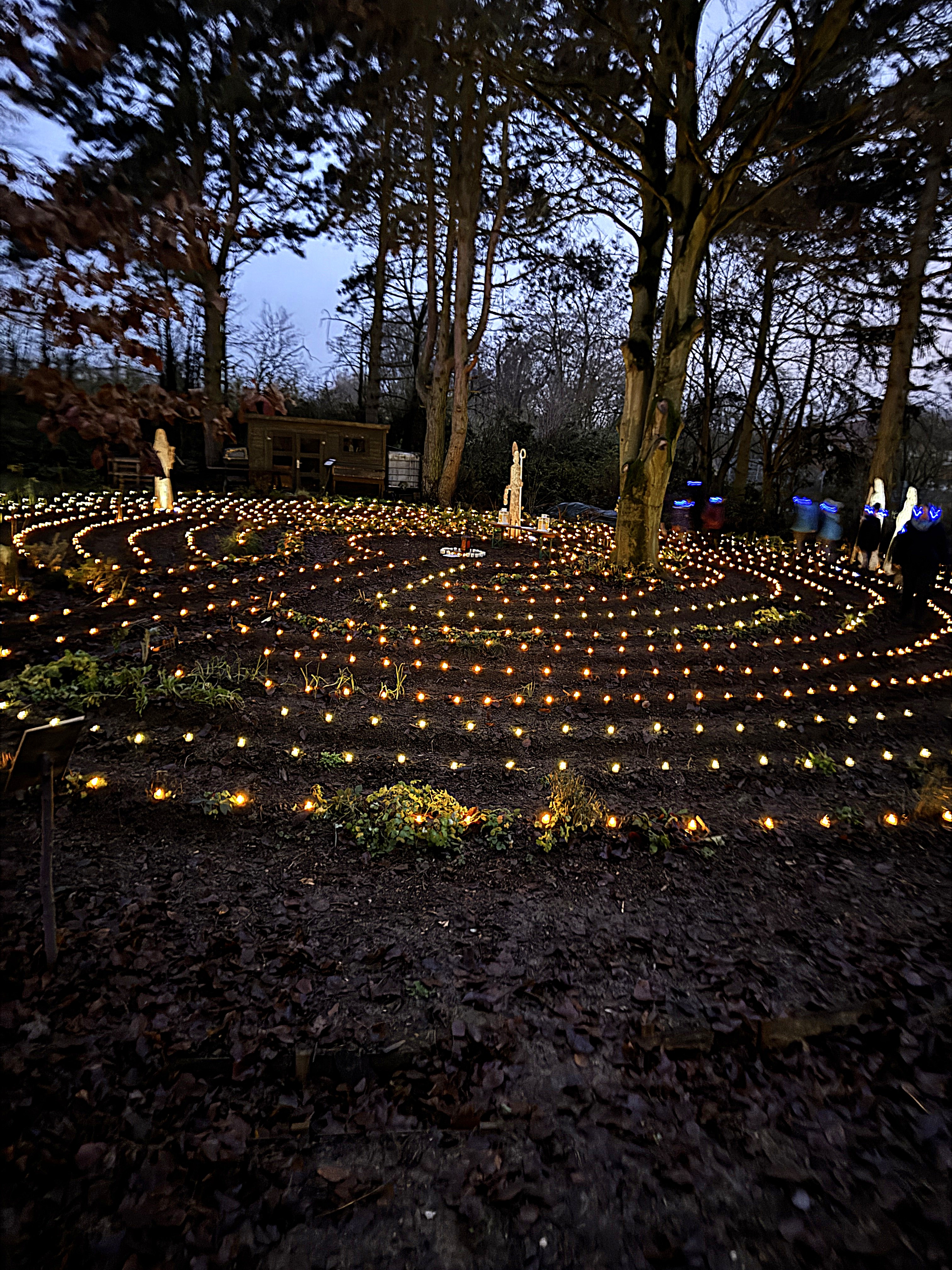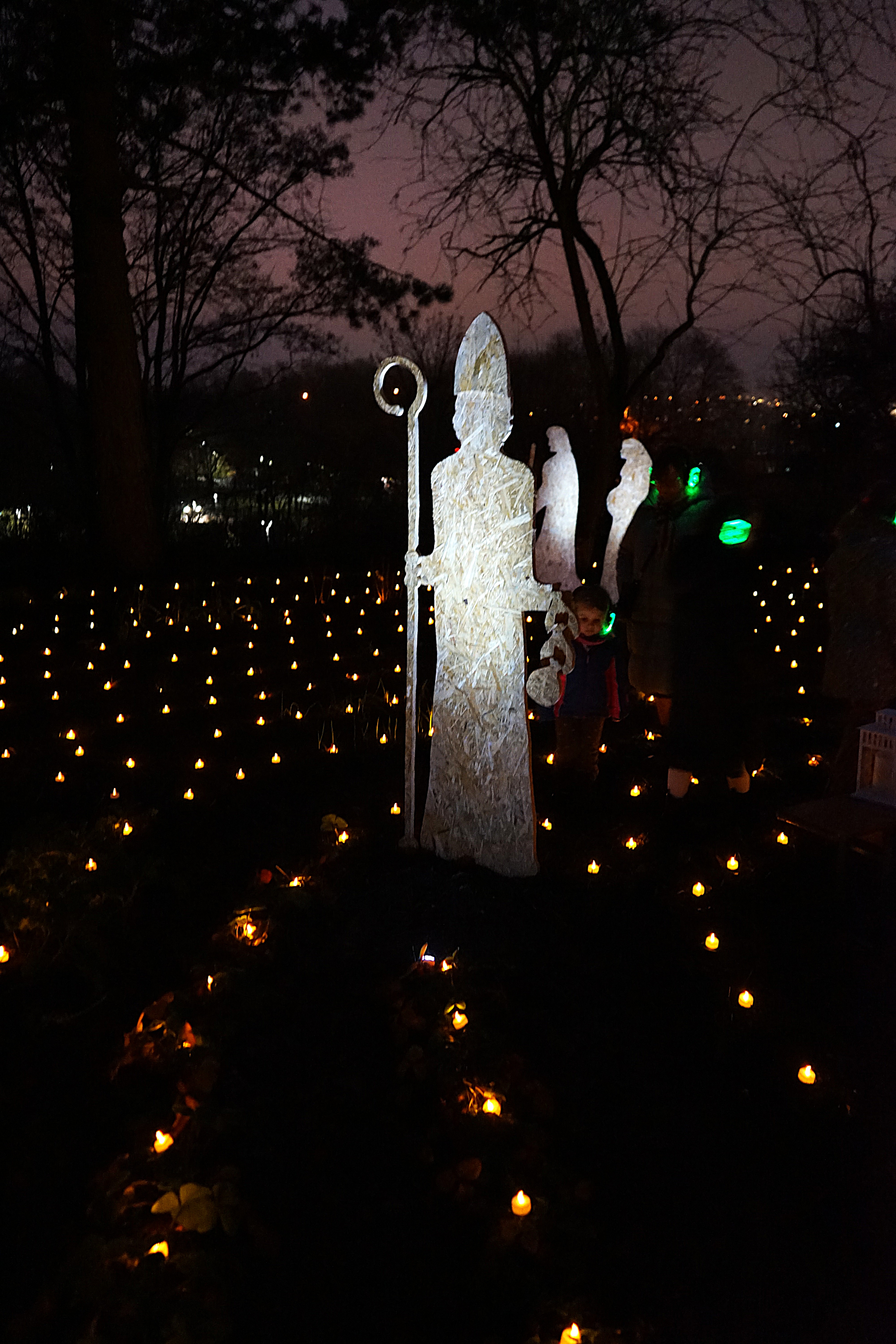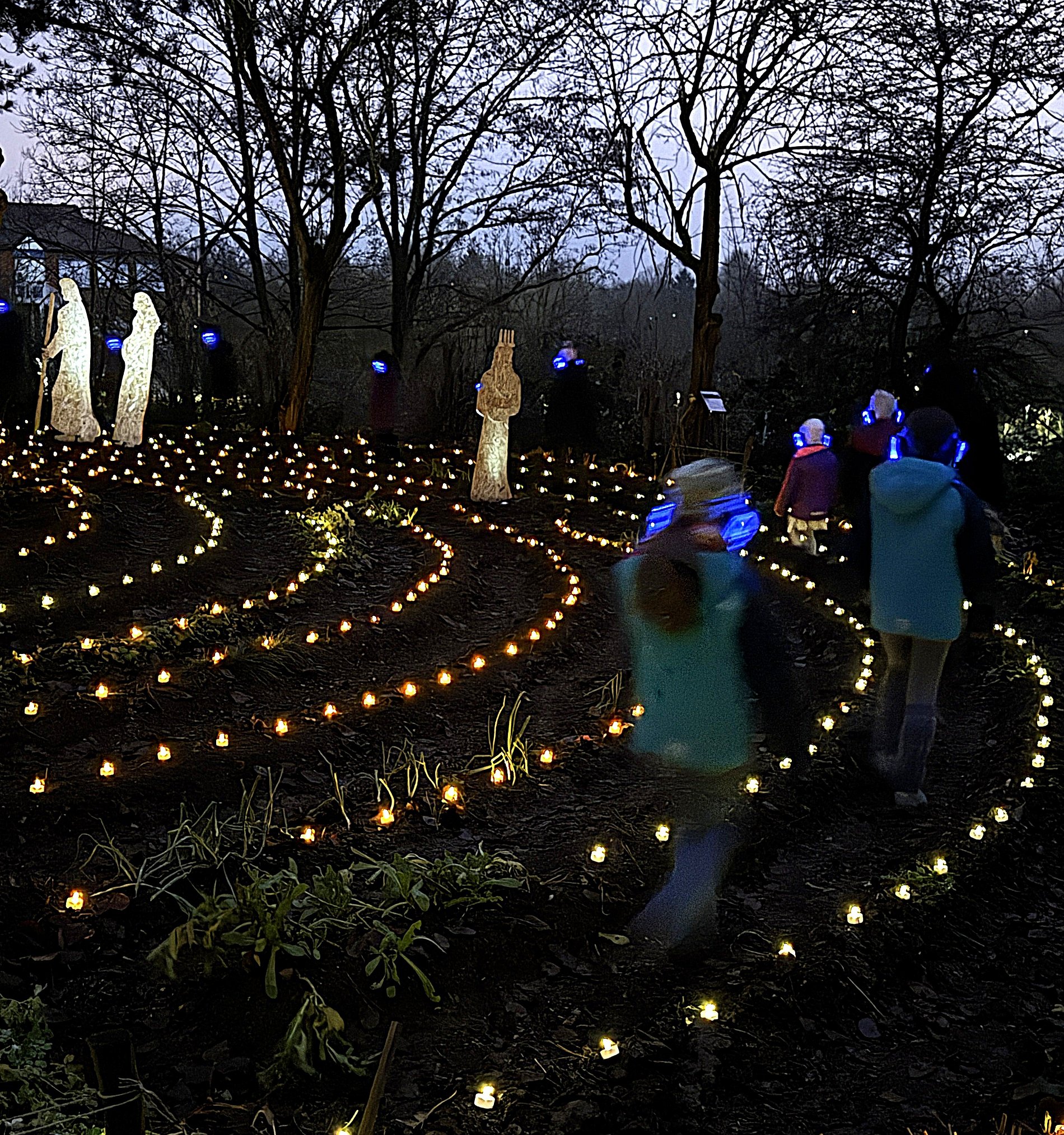 Im Lichterlabyrinth wurden neben den über tausend kleinen Lämpchen auch mehrere Heiligendarstellungen aus Holzschnitt aufgebaut. Eine 25-köpfige Pilgergruppe um Hans-Peter Labonte hatte nachmittags rund eine Stunde für den Aufbau gebraucht. Die Mühe hatte sich gelohnt, denn nun ging man auf dem beleuchteten Weg an der heiligen Barbara, dem heiligen Nikolaus und der heiligen Luzia vorbei. Auch begegneten den Besuchenden Figuren von Maria und Josef auf ihrem Weg nach Bethlehem. Zum Abschluss feierte Schwester Nathalie Korf CJ mit der Gemeinde noch eine Taizéandacht. Der Wunsch nach Frieden stand im Mittelpunkt des Gebets mit Gesang.