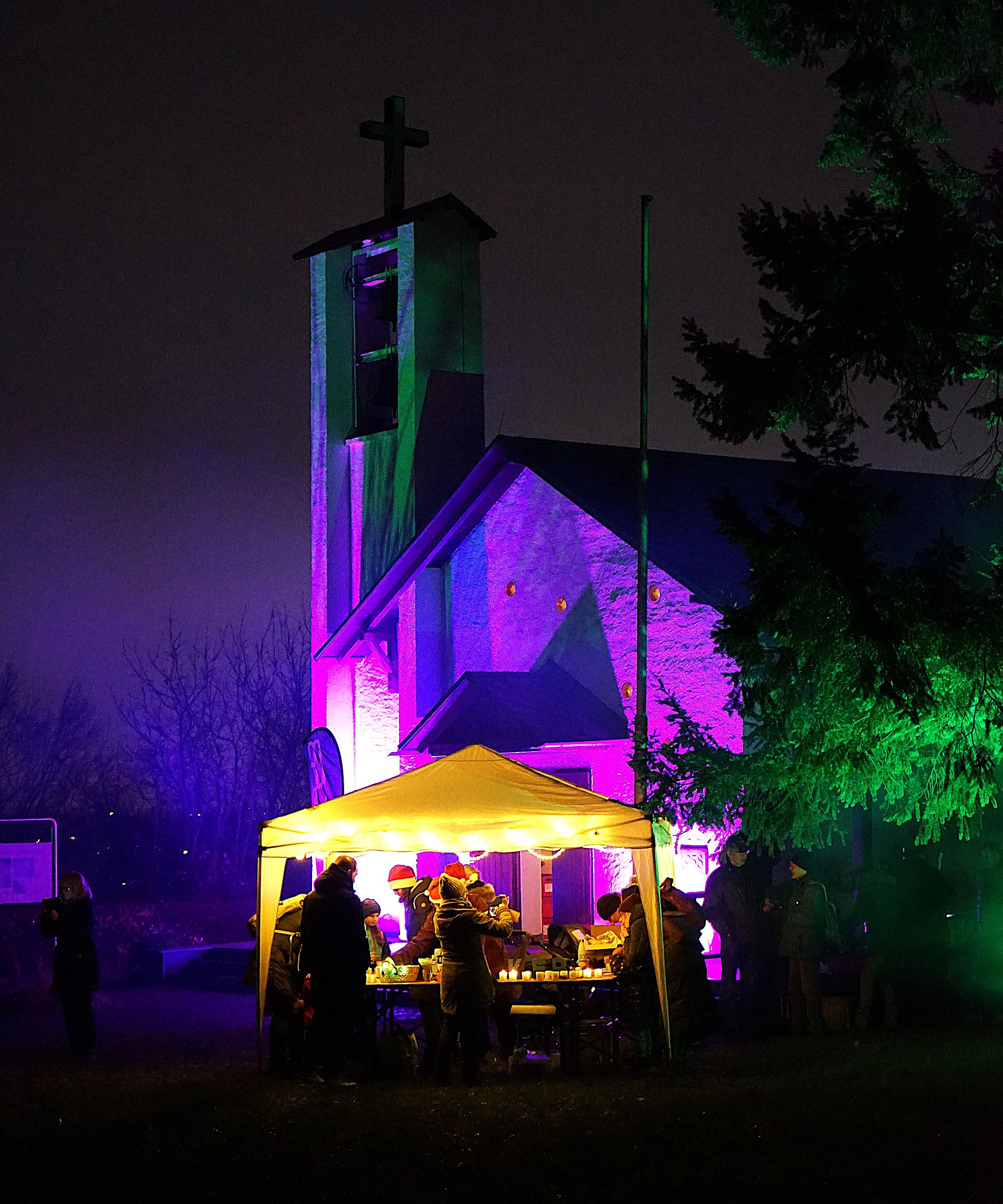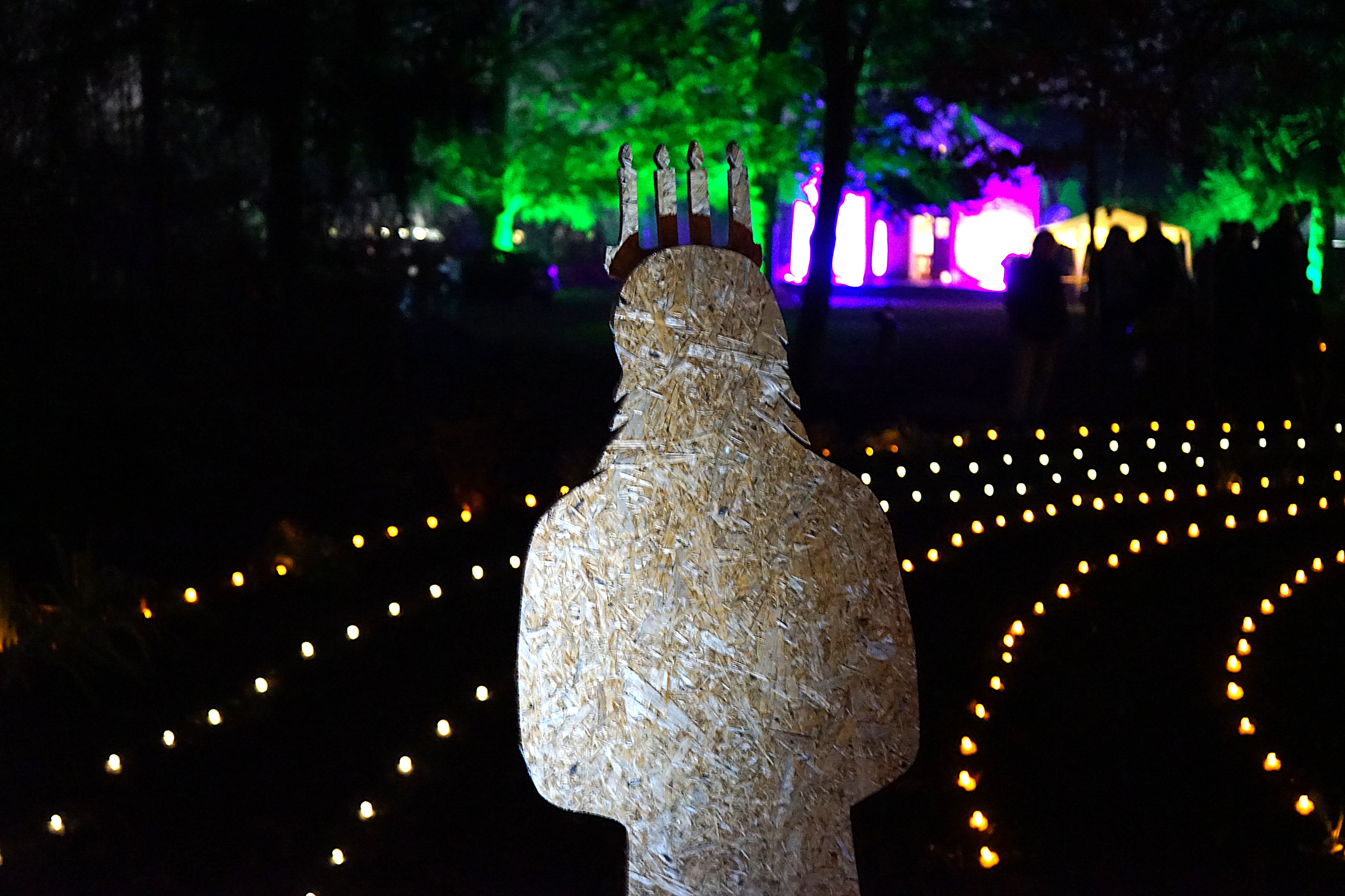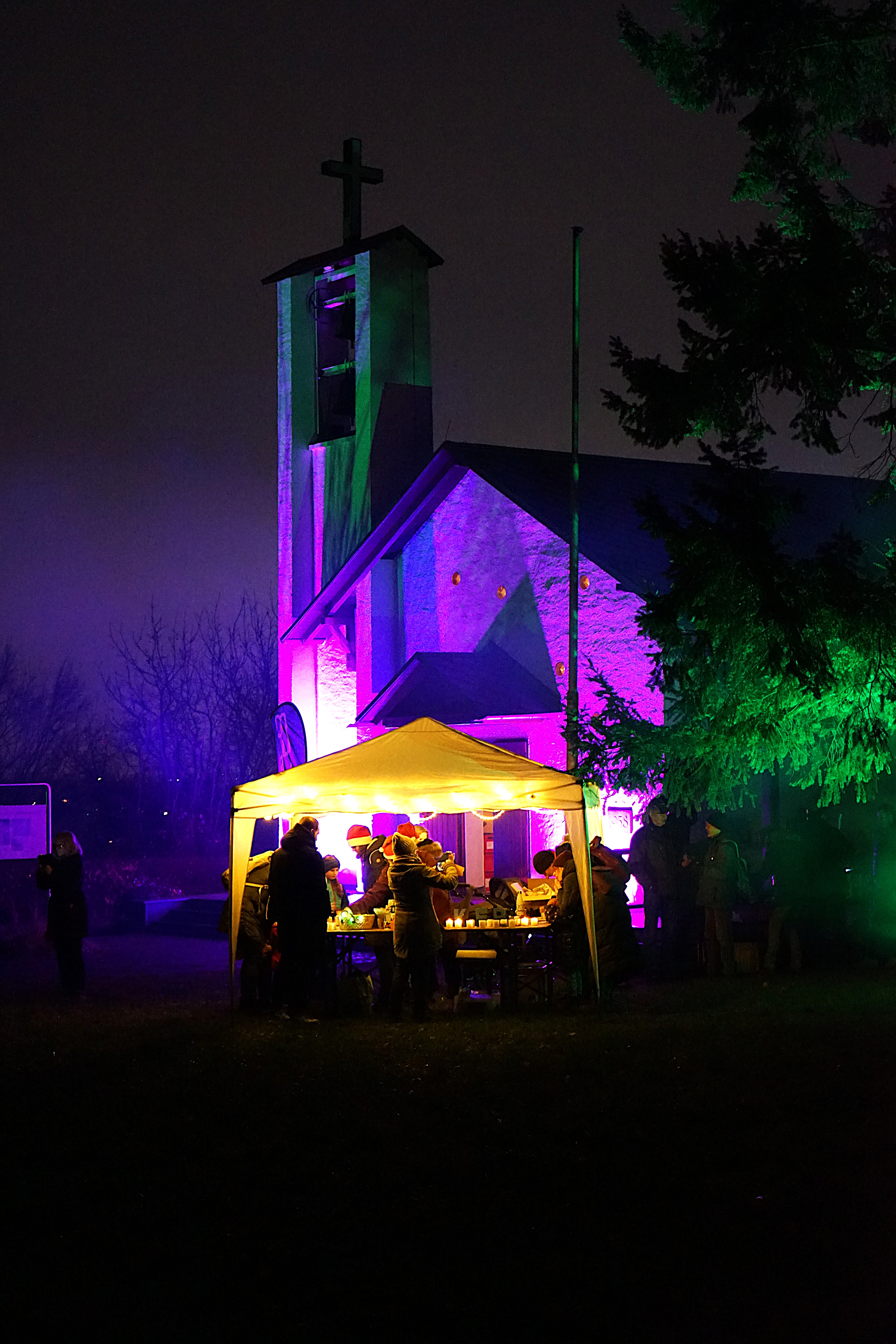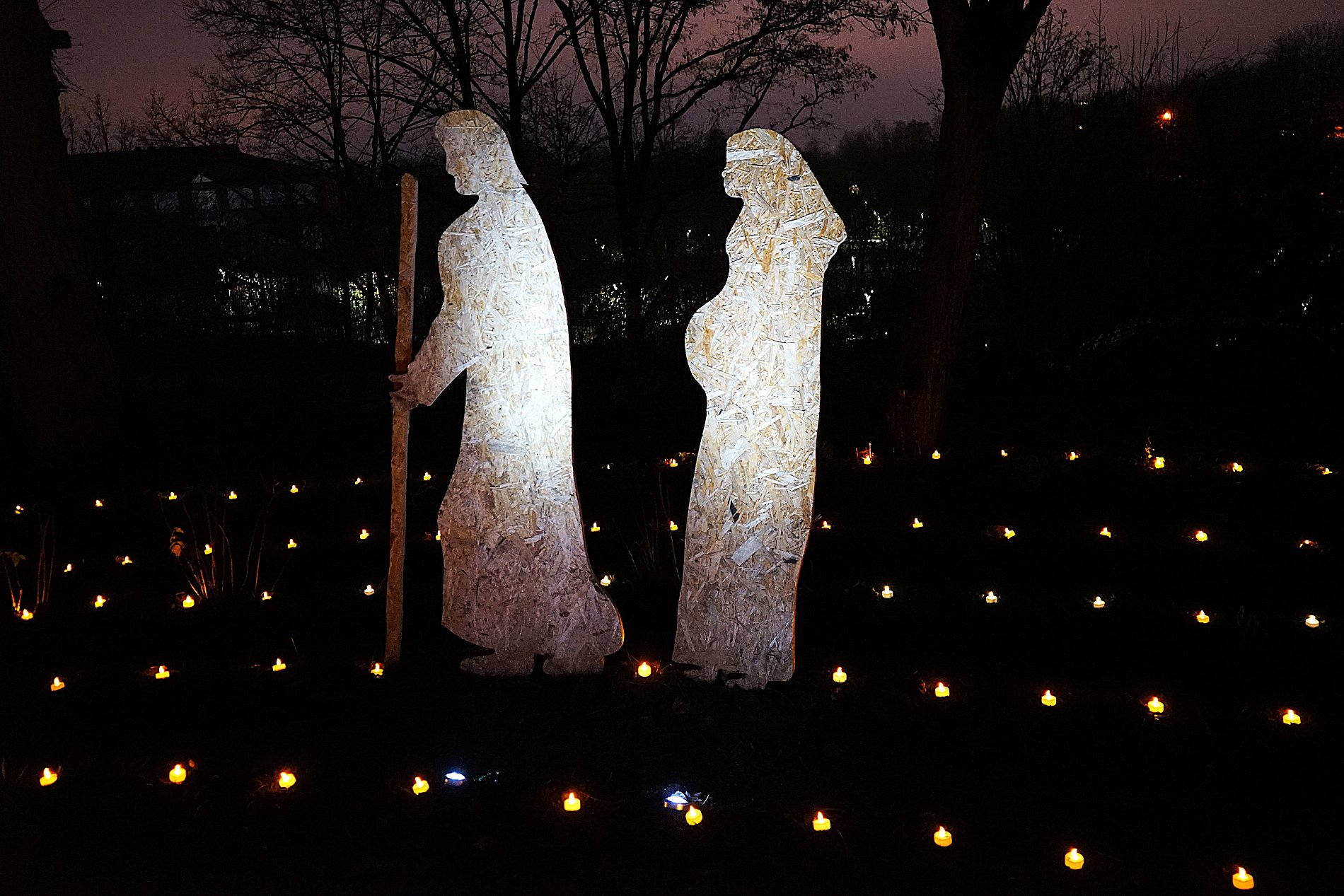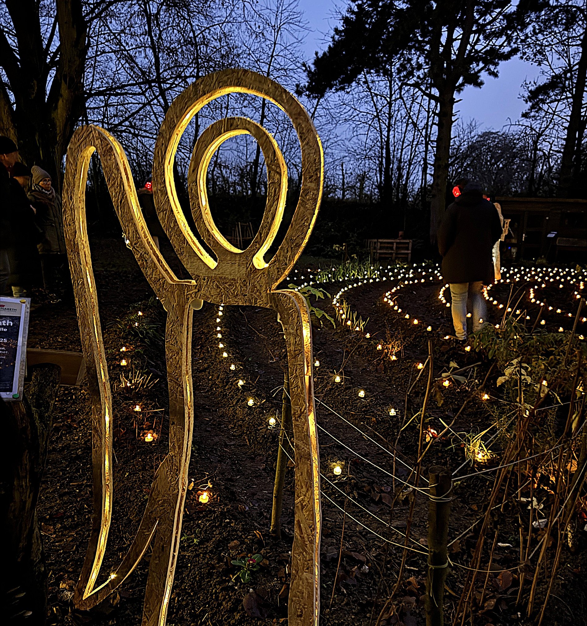 Im Lichterlabyrinth wurden neben den über tausend kleinen Lämpchen auch mehrere Heiligendarstellungen aus Holzschnitt aufgebaut. Eine 25-köpfige Pilgergruppe um Hans-Peter Labonte hatte nachmittags rund eine Stunde für den Aufbau gebraucht. Die Mühe hatte sich gelohnt, denn nun ging man auf dem beleuchteten Weg an der heiligen Barbara, dem heiligen Nikolaus und der heiligen Luzia vorbei. Auch begegneten den Besuchenden Figuren von Maria und Josef auf ihrem Weg nach Bethlehem. Zum Abschluss feierte Schwester Nathalie Korf CJ mit der Gemeinde noch eine Taizéandacht. Der Wunsch nach Frieden stand im Mittelpunkt des Gebets mit Gesang.